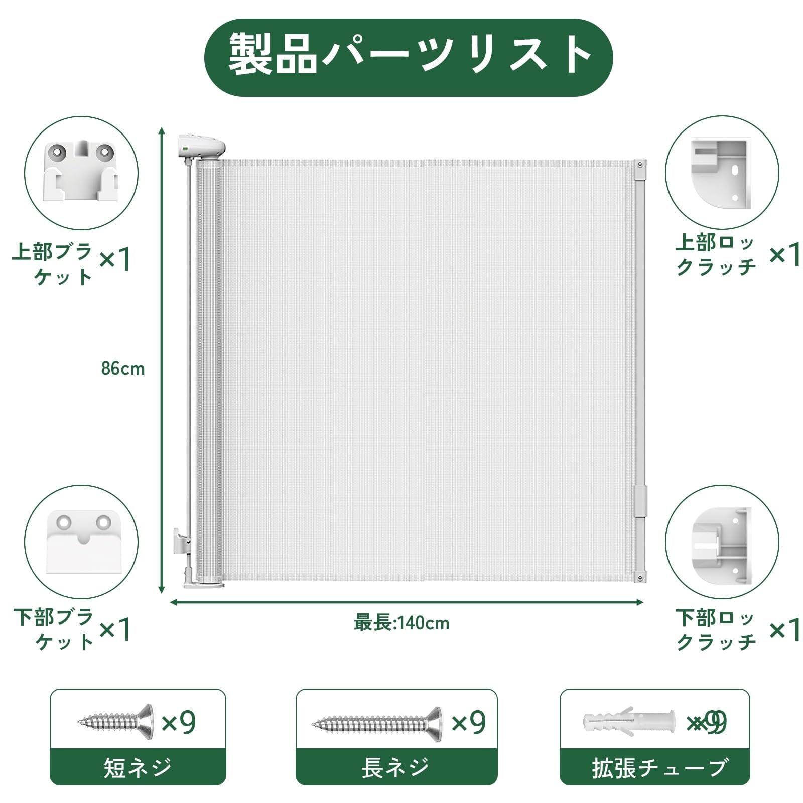 強力なメッシュゲート: 耐久で柔らかいメッシュで赤ちゃんの怪我を防ぎます。すべての部品は無毒無臭です。家に小さなペットがいる場合、ペットがゲートの下の隙間から飛び出ないように、ベビーゲートの下側を地面に近くする方がよいです。ご注意: 穴開けパーツが1セット付属しており、壁に穴を開ける必要があります。