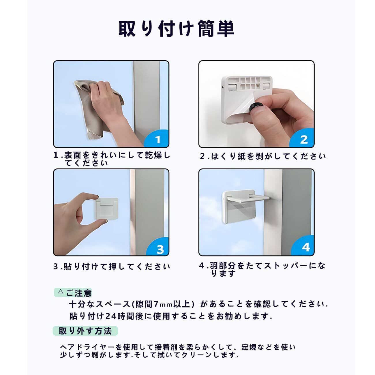 【跡の残らなく剥がせ】この引き戸 ストッパーは両面テープの粘着力が強く、丈夫で実用的です。剥がす時には壁紙を傷付けず取れたできます。上手の方法は強力なシールの糊はドライヤーで温めて10分ぐらいしてからゆっくりとはがすと跡が残り難いです。