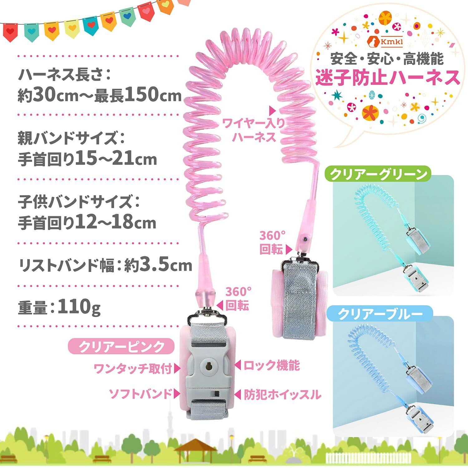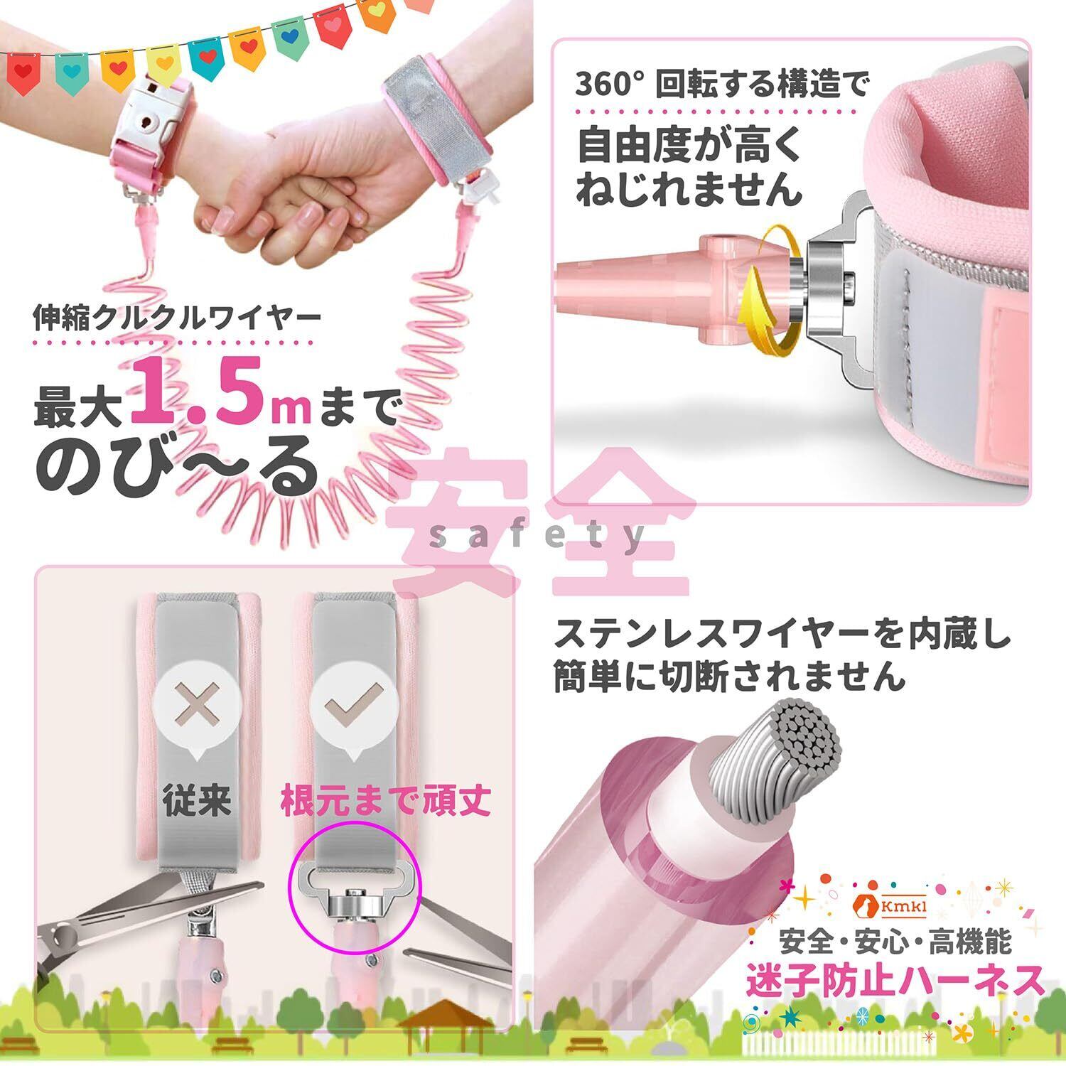 安心の安全性:親子の安全を最優先に考え、優れた安全性を提供します。強固なステンレスワイヤーは手首にしっかりと固定され、子供が安全に探索できる最大1.5m自由な動きを確保します。
