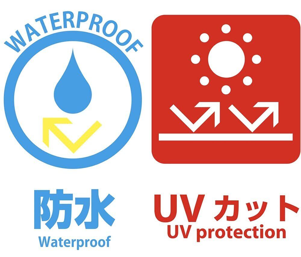 【 耐水性+UVカット 】屋外でも問題なく使用出来る耐水仕様です。さらに、太陽からの紫外線をカットし色あせを防ぐ、透明フィルムによるUVラミネート加工済み。雨が降っても、強い日差しが当たっても問題ありません。