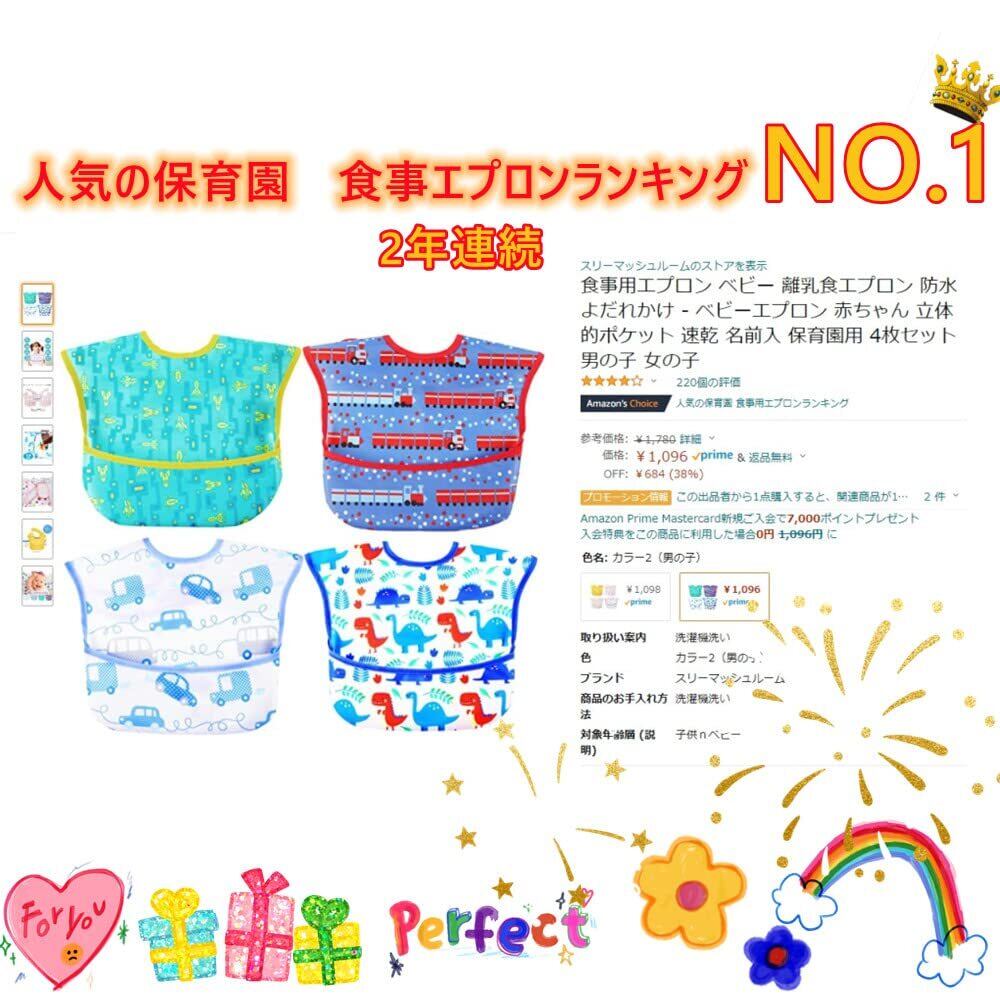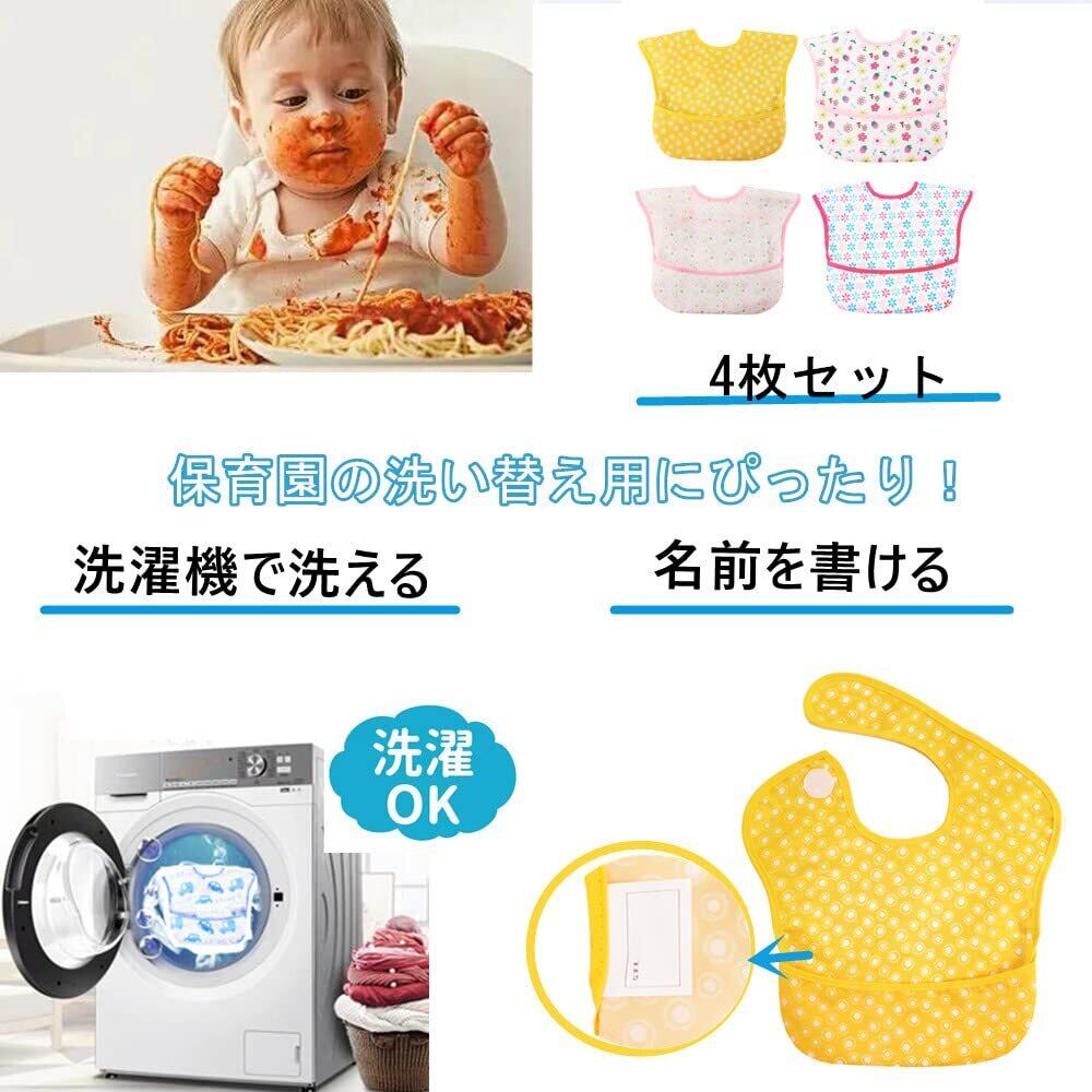 防水食事用エプロン:表側:ポリエステル100%はっ水加工生地 裏地:ラミーネット防水加工【中国製、日本企画】【対象年齢】~4歳【一枚一枚検品済み】※30日商品が到着後30日以内に返品・交換ができる。 油汚れが取れやすい食事エプロン:水につけると、油汚れが浮き、さっと綺麗に取る。台所や外出先でも洗いやすい。 立体的ポケットのベビーエプロン:裏返しタイプの食事エプロン。食べこぼしをしっかりキャッチ way使いの食事スタイ:スタイ型でそのまま使うと離乳食スタイ、ポケットが裏返しすると食事エプロン 保育園用食事エプロン:裏に名前シールのタグが付く。4枚セットで保育園に大活躍。