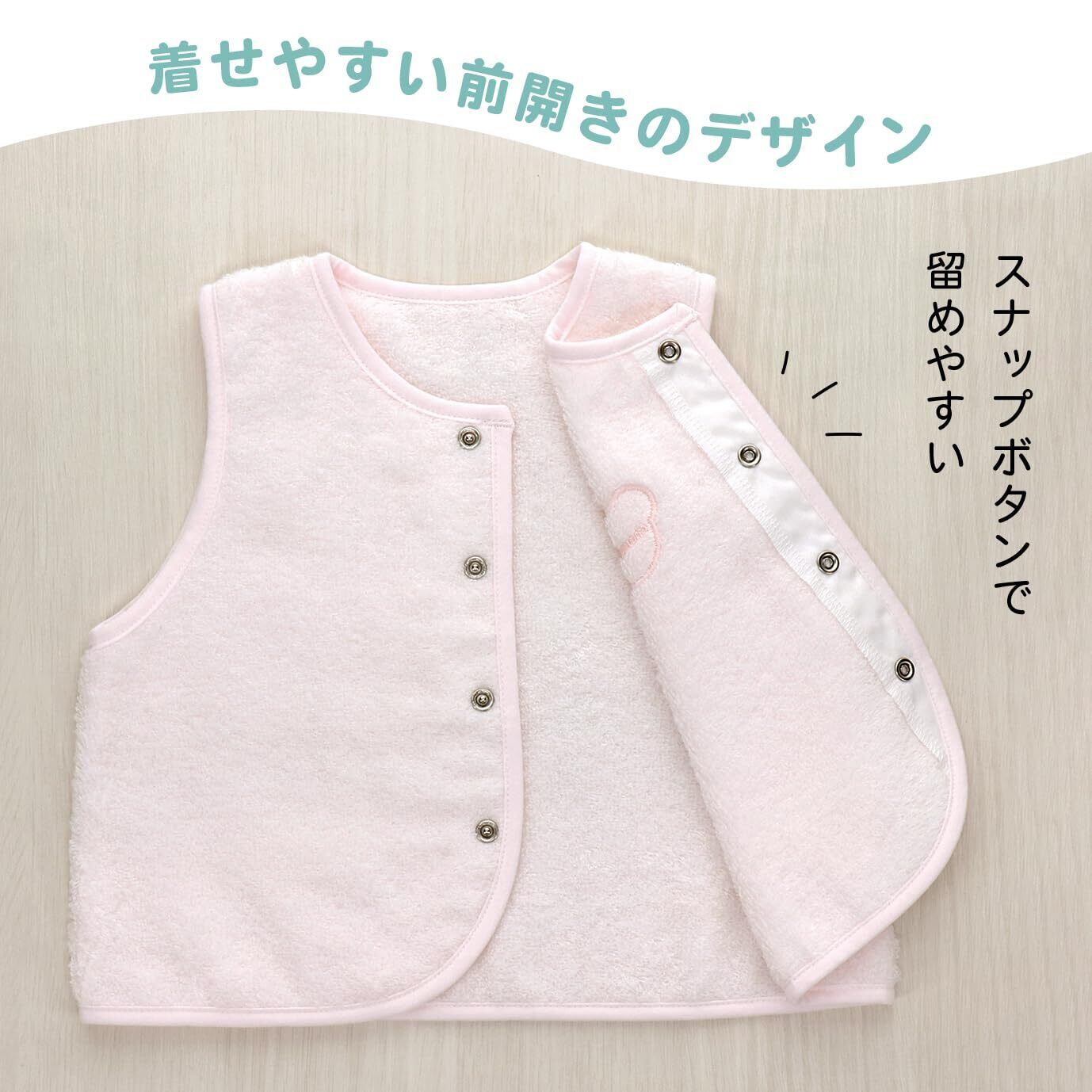 お洋服ともコーディネートしやすいシンプルなデザインで胸元の刺しゅうがアクセントになったベストです。 やわらかな無撚糸タオルでおうちの中でもおそとでも手軽に羽織れ、赤ちゃんの体温調節に便利なアイテムです。