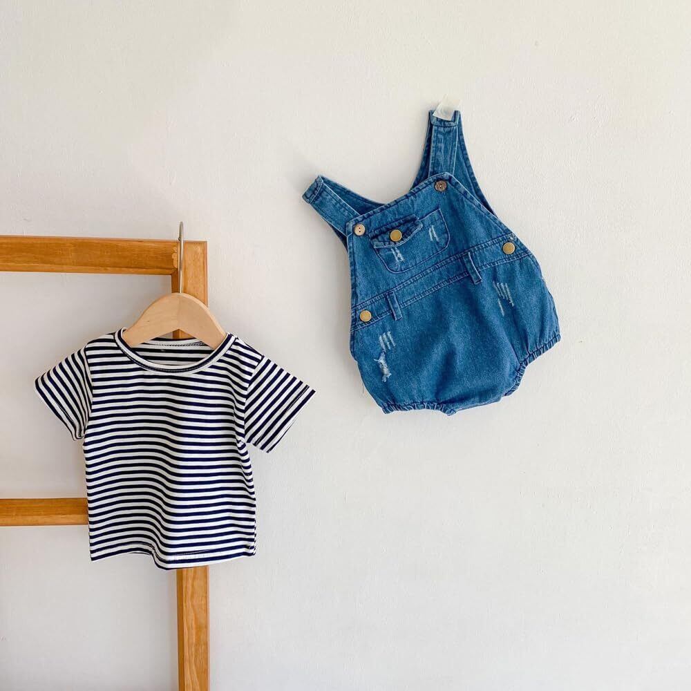 ボーダーTシャツ、デニムサロペット、二段階可調節。お尻の部分にスナップボタンがあり、オムツ替えもラクラクです。
