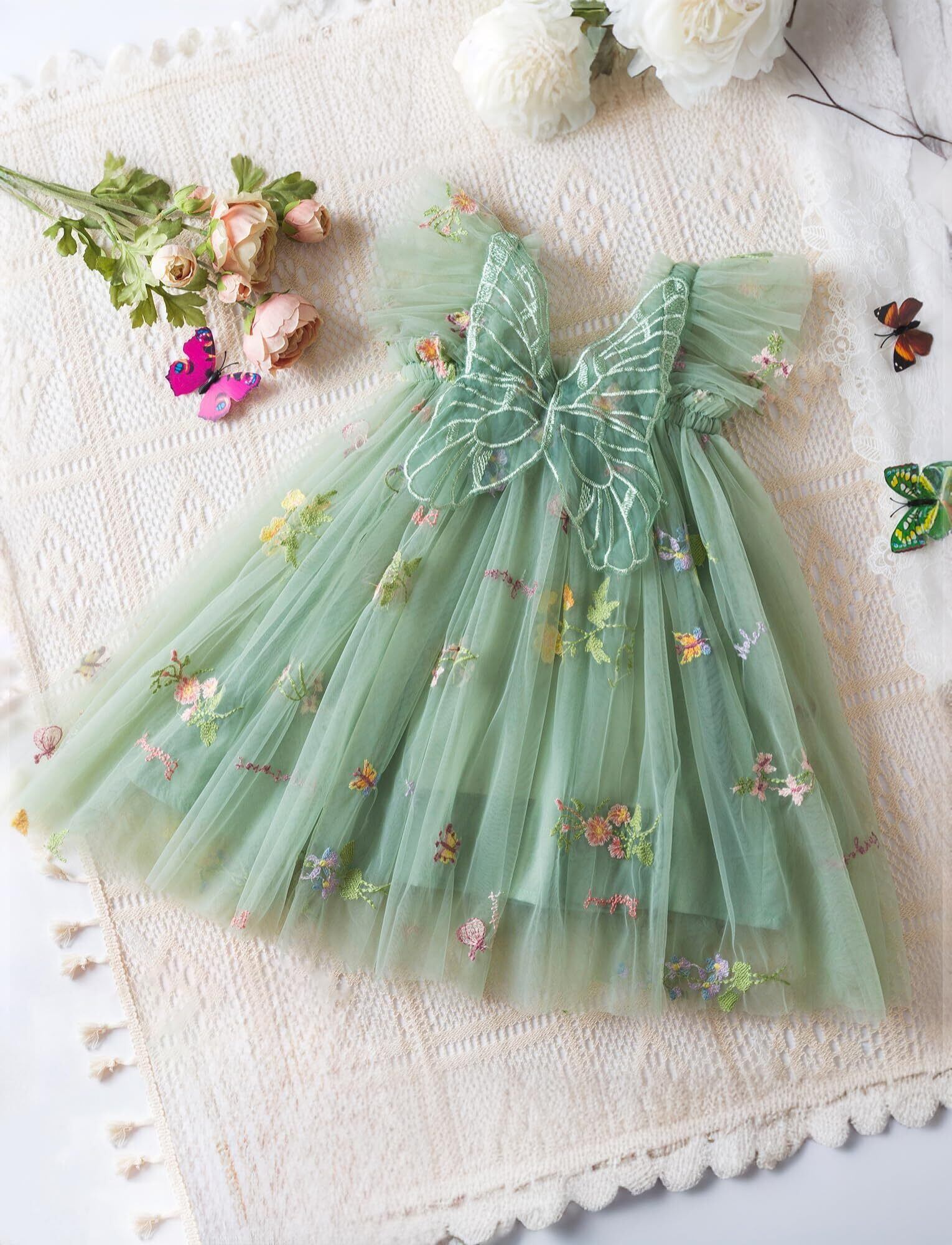 ベビー服として最適なチュールワンピースは、女の子のためにデザインされたふんわりとしたチュチュドレスです。華やかな花の刺繍と蝶の装飾が特徴で、プリンセス風の魅力を引き立てます。