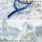 【お得な3枚組 コンビ肌着 新生児肌着セット】男の子向けのデザインの違う3種類で構成され、大変お得な新生児肌着セットとなっております。
