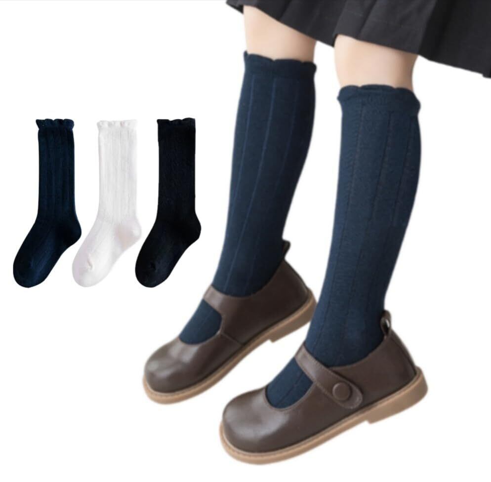 Koala Mama シンプル モノトーン ハイソックス 綿 ベビー キッズ ソックス 子供 靴下 可愛い 女の子 ガールズ お姫様 ジュニア 3足 セット 白 黒 ネイビー 入学式 卒業式 発表会 無地