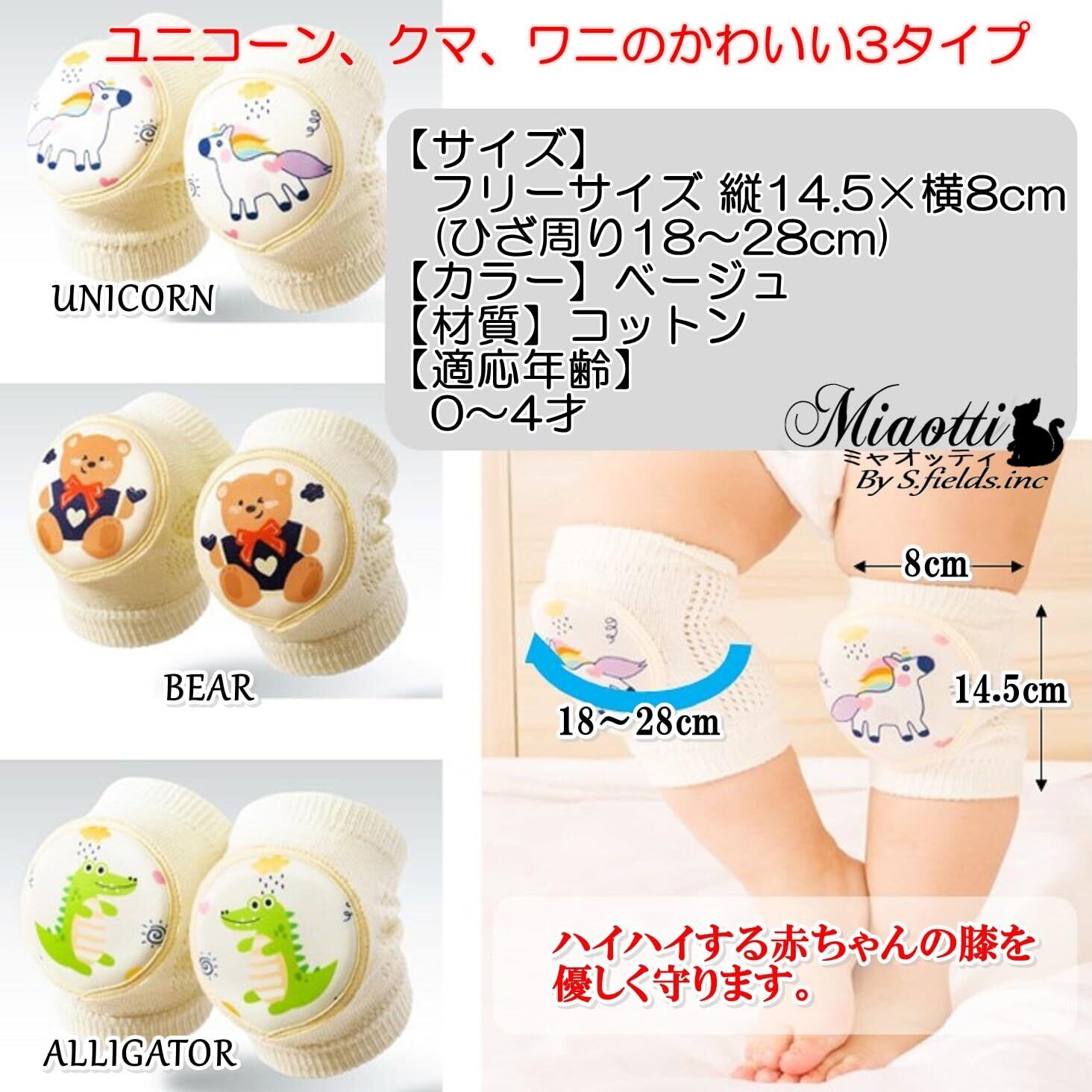 ハイハイする赤ちゃんの膝をやさしく守るニーパッドです。赤ちゃんが膝をぶつけてケガをしたり、黒ずんだり、赤くならないようしっかり保護します。ユニコーン、クマ、ワニのかわいい3タイプからお選びいただけます。