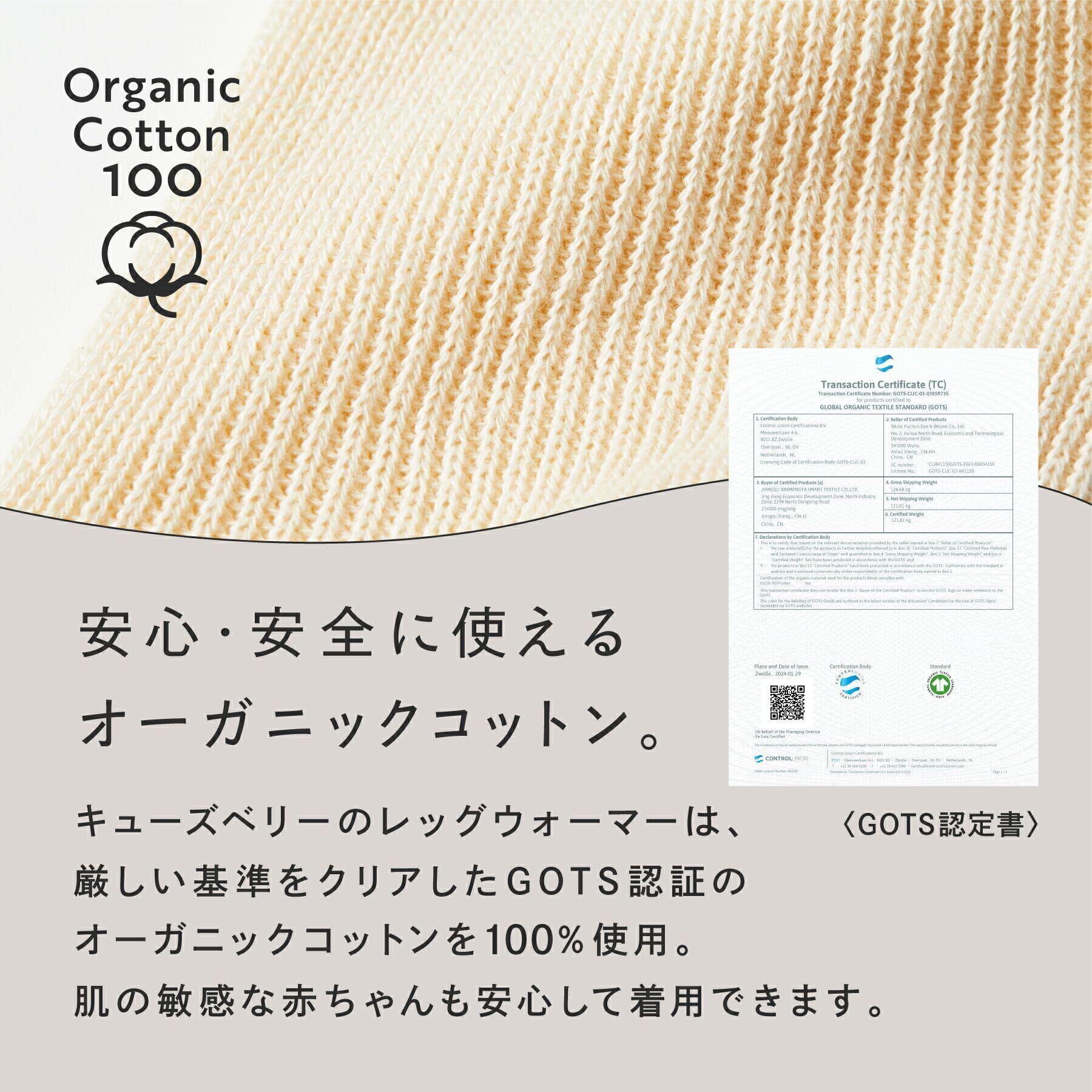 寒い日も暑い日も、赤ちゃんの足元を快適に保つレッグウォーマーです。 赤ちゃんの足は、寒さや冷房などの影響を受けやすい部分ですが、そんな赤ちゃんの足を温かく守ってくれます。 また、オーガニックコットン100%素材なので肌に優しく、伸びやすく履きやすくなっております。 足裏は出したまま膝やふくらはぎだけを覆う形になっているので、冬は暖かく、夏は涼しく快適に過ごせますし、また、リブ編み生地は伸縮性があり、足にフィットしても締め付け感がありません。 歩き始めたら滑りにくいし、オムツ替えも楽々です。 ワンタッチで着脱できるので、お出かけやオムツ替えの時にも便利です。 大きくなったら赤ちゃんが自分で履けるようになるのも良いなと思います。 肌に優しいオーガニックコットン100%で作られていますが、GOTS認証という厳しい基準を満たした素材です。 ママ・パパも安心してお使いいただけます。 色は8色ありますが、それぞれプロのグラフィックデザイナーと丁寧に選定いたしました。どんな服にも合わせやすい色合いになるようにこだわっています。ぜひ兄弟やお友達とお揃いにして楽しんでいただければ幸いです。 稀にレッグウォーマーにネップという不均一な糸が表面に見えることがありますが、これは製造過程にできるものですので、予めご了承いただければ幸いです。製品の機能性や耐久性に影響はございません。