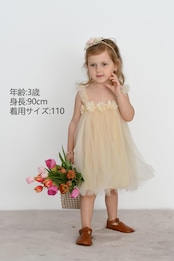 【デザイン】ドレスの胸元には立体的なお花の装飾、ハイウエストのチュールドレス、ナチュラルなふわふわ感、女の子の可愛さをより引き立ちます。