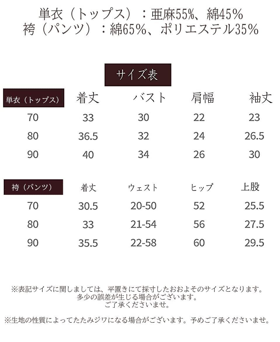 ■単衣(トップス):亜麻55%、綿45%■袴(パンツ):綿65%、ポリエステル35%。おしゃれでかわいい袴風セットアップ。上下が分かれているので脱ぎ着しやすく、お子様を寝かせる必要もなくお洋服と同じように着替えができます。