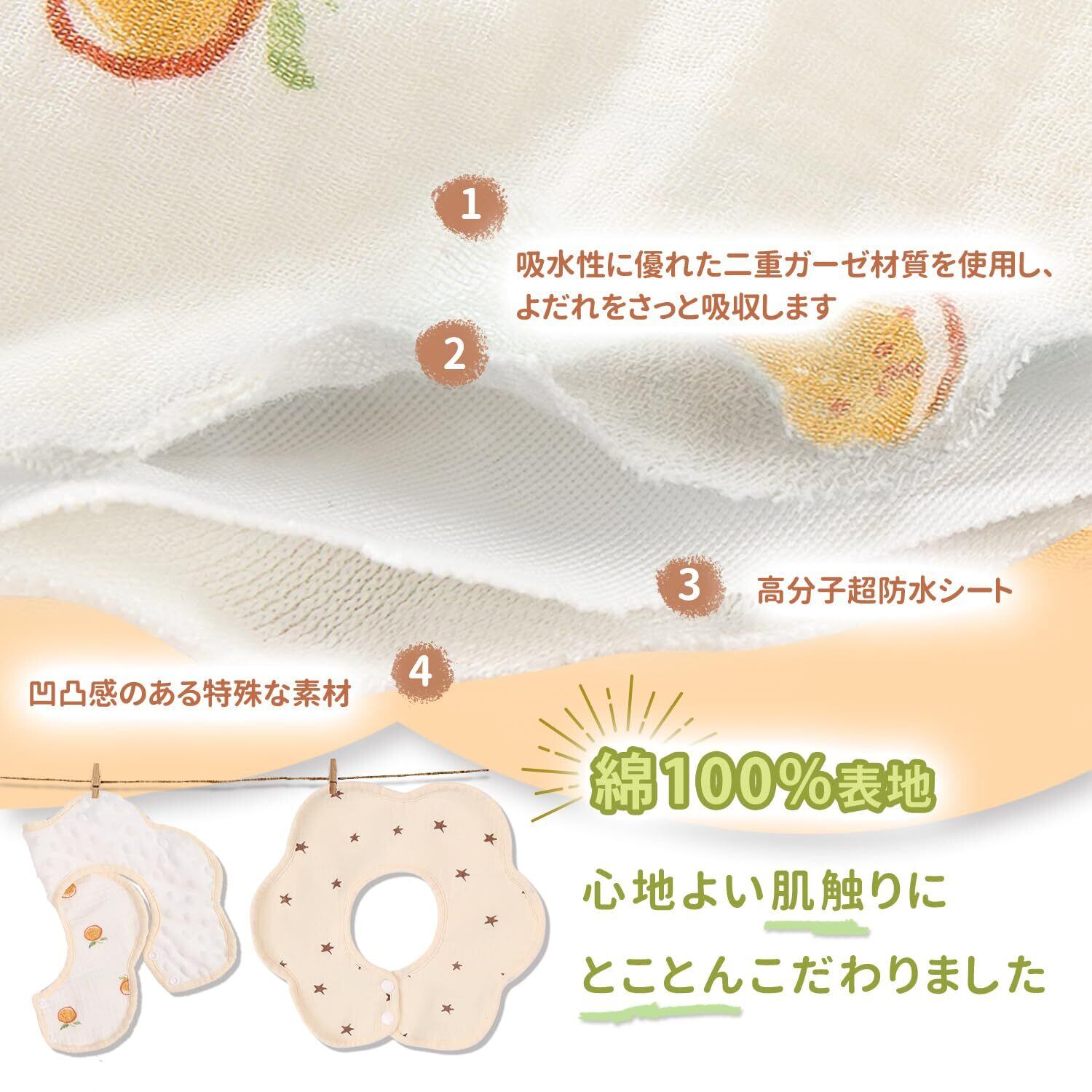 【綿素材使用】コットン100%表地の肌と環境に優しいよだれかけです。赤ちゃんが舐めたり噛んだりする可能性を考えて、蛍光剤やホルムアルデヒド等の有害な化学物質は一切なし、赤ちゃんが安心して使用できます。裏地は3D凸凹感あるの特殊な素材、ふんわりとした肌触りでベビーの肌を守ります。