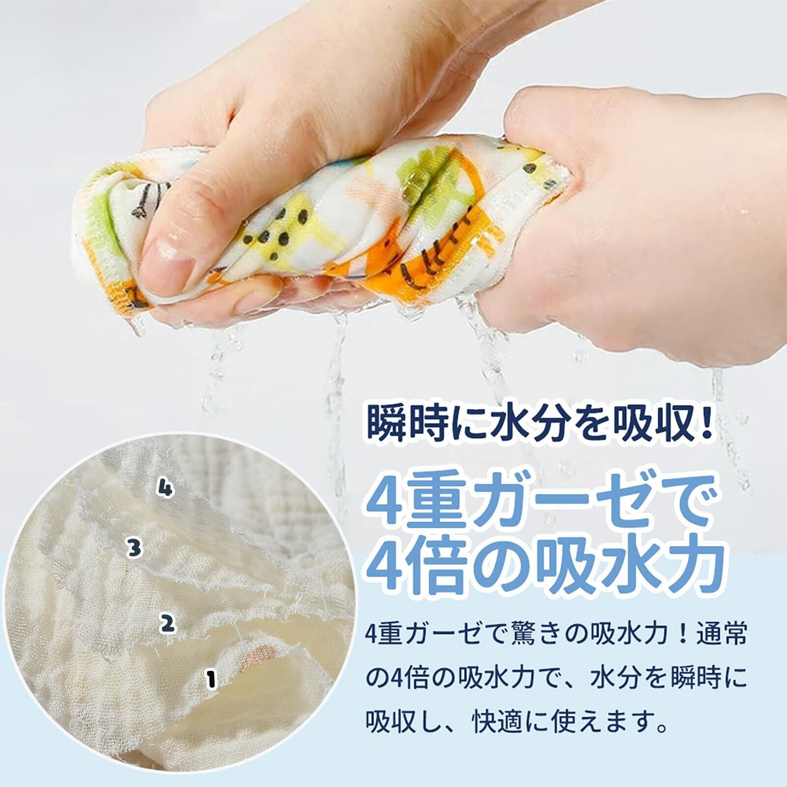 4倍吸水量4層ガーゼでさっと水分を吸収し、速乾性もよくいつでも気持ちよくお使い頂けます!
