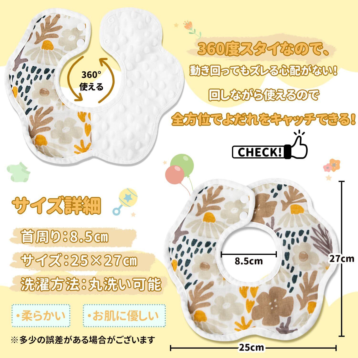 【360度回転可能】360度使用できる花びら型スタイは、食べこぼしなどで濡れた面を回転させれば、取り替えずに再度使用できます!吸水性、通気性あり360度回転可能なので、動き回ってもズレる心配がありません。全方位でよだれをキャッチできるので、お洋服などを汚しづらくいつでも清潔に。