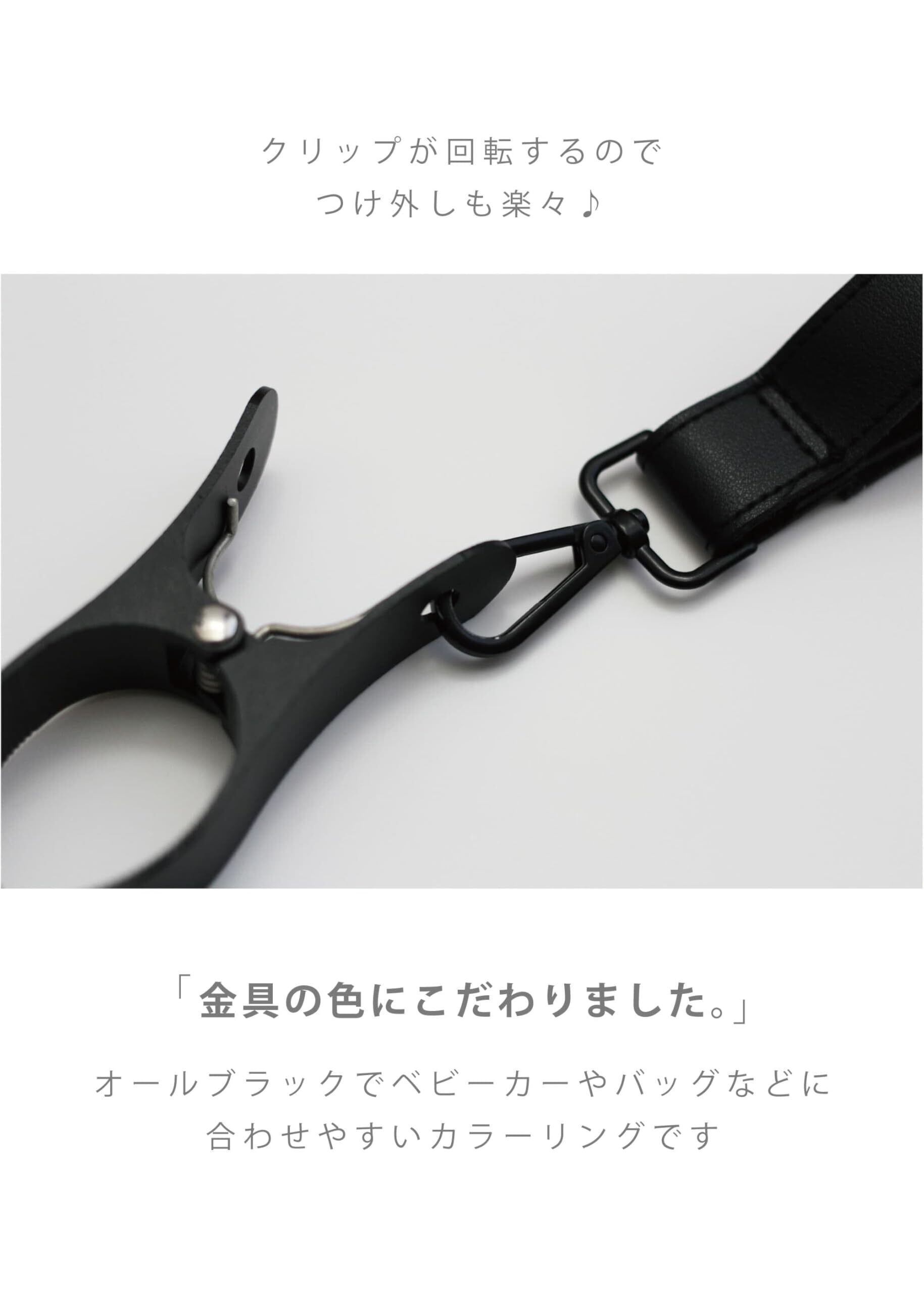 商品の特徴:ベルトとクリップを接続する金属とクリップの色の統一感あるデザインに。シンプルでどんなベビーカー バギーにも合わせやすい。悪目立ちしない上品でおしゃれな実用品。