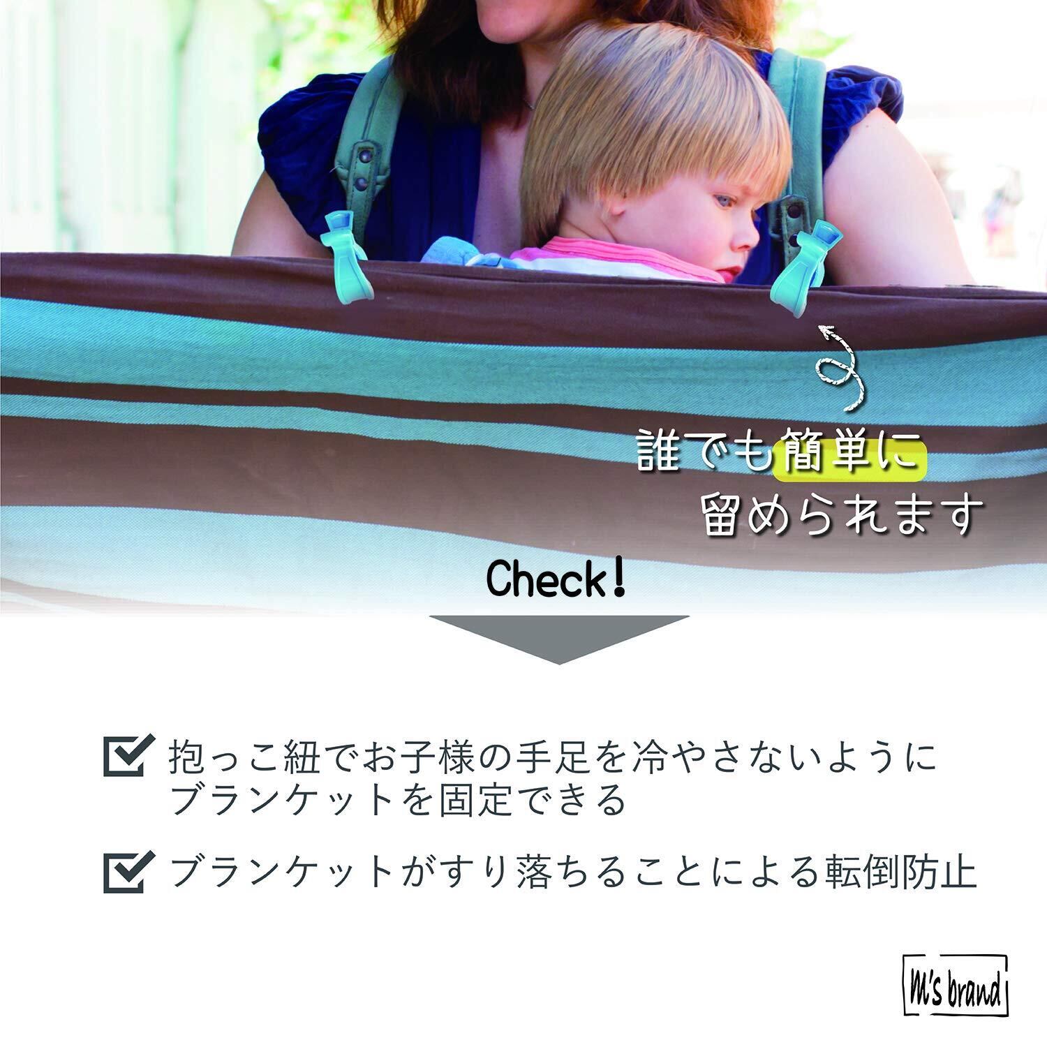 「m's brand」製のブランケットクリップは、ブランケットを留めるクリップとして最適な商品になります。 抱っこ紐でお子様を抱っこしていると、足や手が露出して、冷えてしまう心配がございます。また、ブランケットを羽織っても、留めれない設計のブランケットですと、すり落ちてしまい、うまく羽織れないだけではなく、転倒などの原因に繋がる可能性がございます。本製品のブランケットクリップをご利用頂くことで、誰でも簡単にブランケットを留めることが可能になりますので、お子様の体調を守れて、ブランケットがすり落ちて転倒するなどの心配がなく、安心してご利用頂けますので、お子様が居るご家庭には、とくにオススメの商品になります。