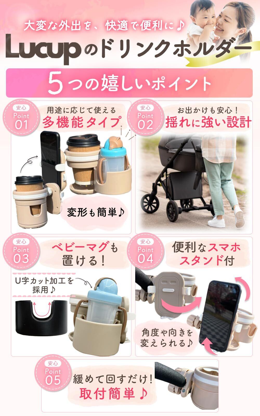 ベビーカードリンクホルダー 2点で固定 スマホホルダー付き 多機能 360°回転 高耐久耐水 Lucup