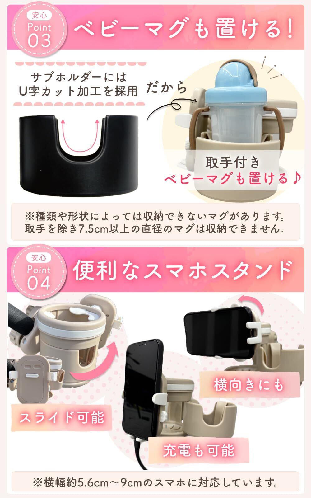 【動きに強くベビーマグも置ける】ホルダーにはストッパーを搭載しているので段差の衝撃等、突然の動きにも強くなっています。また、U字カット加工をしているのでベビーマグにも対応しています。