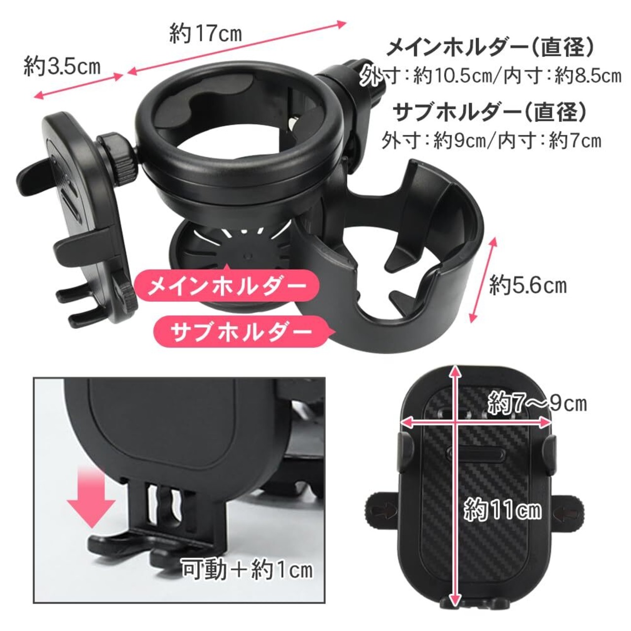 メインホルダーにはシリコン状のツメがあるため、振動でドリンクが落下しないようにしっかりホールドする仕様です。サブホルダーを展開することで、ドリンクを2個同時に設置していただけます。