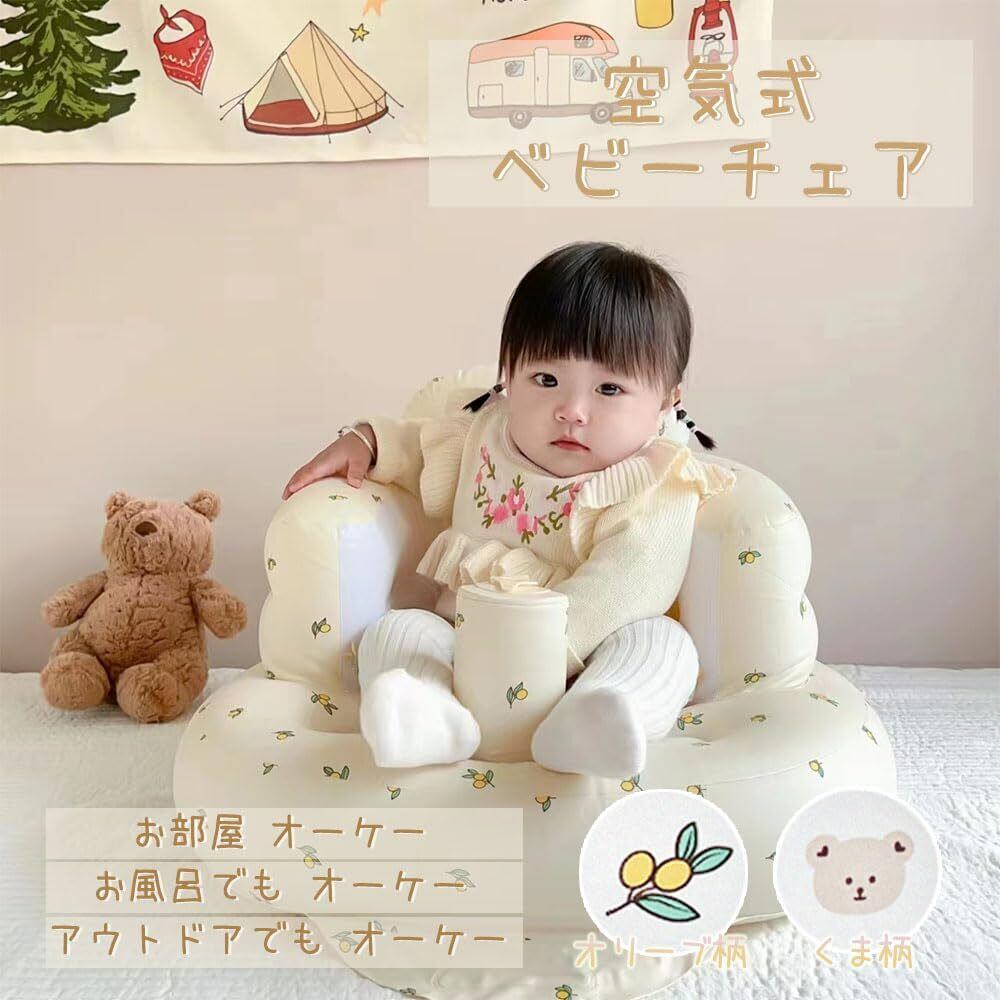 BubuBubu バスチェア ベビーチェア 赤ちゃん ベビー用バスチェア ベビーソファー ふわふわシャワーチェア イス 空気椅子 お座り練習チェア エアーポンプ内蔵 お風呂 食事用 折りたたみ コンパクト 収納便利 空気式 水切れ 出産祝い (オリーブ)