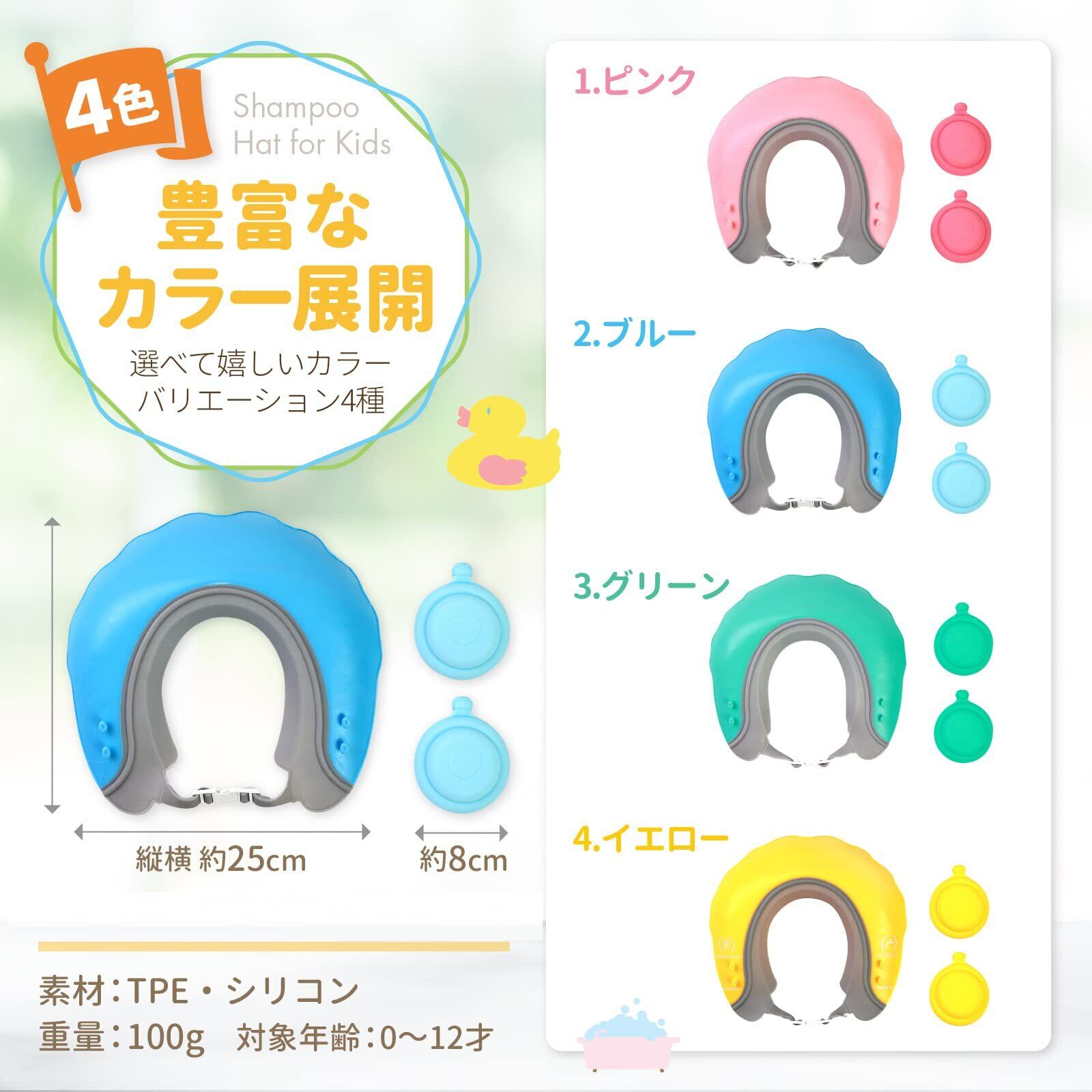 【丈夫な素材を使用】丈夫なTPE素材で作られていて、厚みもしっかりあるので、水圧でへこたれる心配もありません。体との接着部はシリコン製で肌に優しく水が漏れる事もありません。 【顔と耳が濡れない】顔の前に水が流れないバックサイド排水設計を採用しており、水が怖いお子さんでも安心して使用頂けます。また2段階で位置を調整出来る耳当ても付いていて耳の中に水が入る心配もありません。
