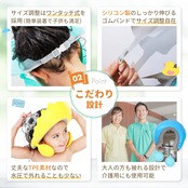 【顔と耳が濡れない】顔の前に水が流れないバックサイド排水設計を採用しており、水が怖いお子さんでも安心して使用頂けます。また2段階で位置を調整出来る耳当ても付いていて耳の中に水が入る心配もありません。