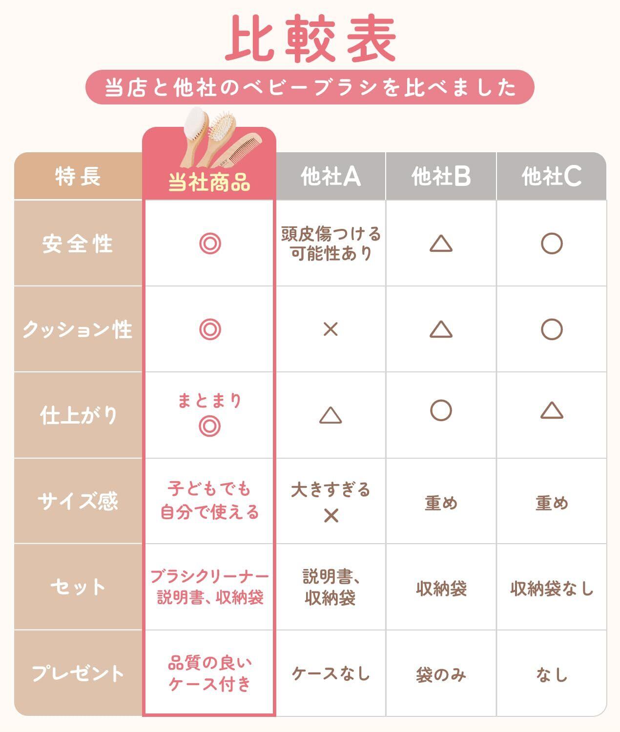 ギフトにも最適!毎日使うものだから、出産のプレゼントとしても大変人気です。髪の毛がサラサラになると、私たちもお子様も気持ちがいいもの。こちらのヘアブラシをプレゼントして、ぜひ『毎日かわいい!』を実現しちゃいましょう!サイズ:羊毛ブラシ縦18cm x 横5cm 重さ55g、クッションブラシ縦18cm x 横5cm 重さ51g、コーム縦13.5cm x 横4.0cm 重さ17g、ブラシクリーナー縦6.5cm x 横5.3cm x 重さ17g