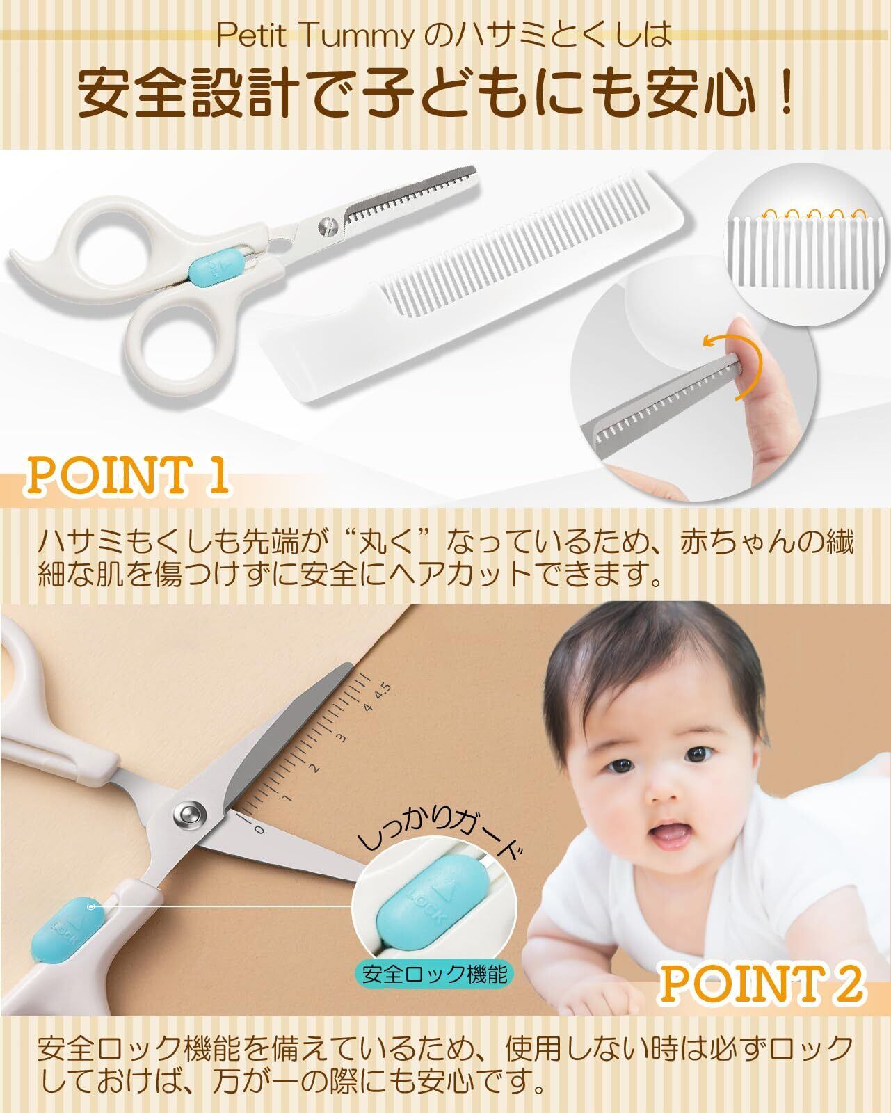 【安全設計】お子様の繊細な肌を傷つけないように、Pettit Tummyのハサミは先端が丸くなっており、ストッパー機能も備えているため万が一の際でも安心。