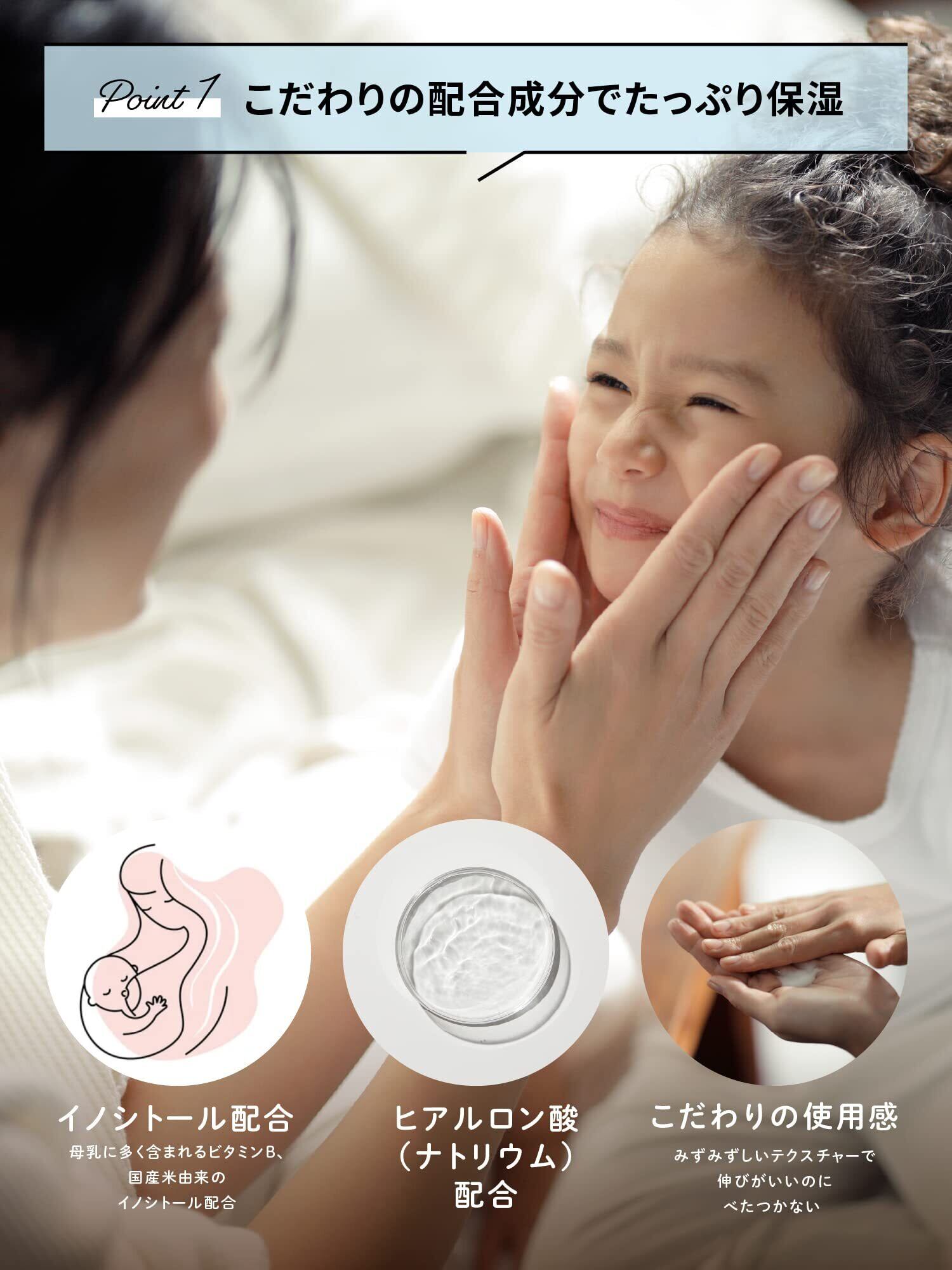 【大容量300ml】毎日の保湿に嬉しい大容量。片手でも使いやすいポンプ式のボトルで簡単に家族みんなの全身保湿が叶います。安定感のあるボトルと使いやすいポンプ式なので、お風呂上がりのバタバタでもさっと簡単にケアが可能に。子どもが自分で使ってくれるのも嬉しく、時間に追われるママやパパのスキンケアにもオススメです。また、最後まで衛生的に使い切れるように2重構造のソフトボトルを採用。開封後も空気に触れにくいので「新鮮なまま最後まで使い切れる」ように改良しました。