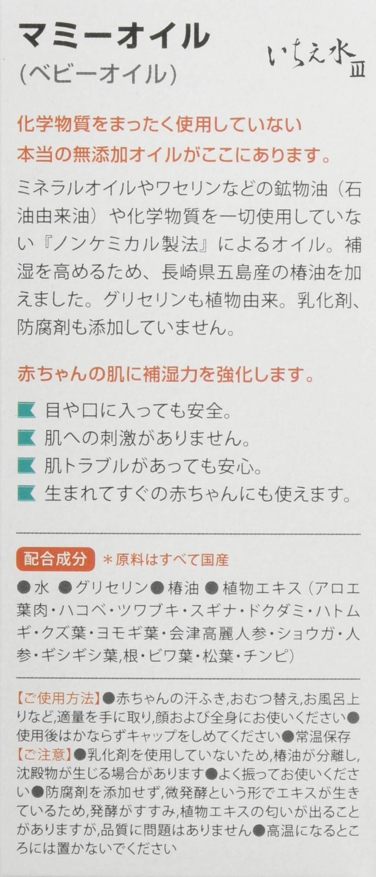 乳化剤(界面活性剤)を使用していないベビーオイル。全身を補湿できます。マミーウォーターと合わせてのご使用で保湿の強化にも。