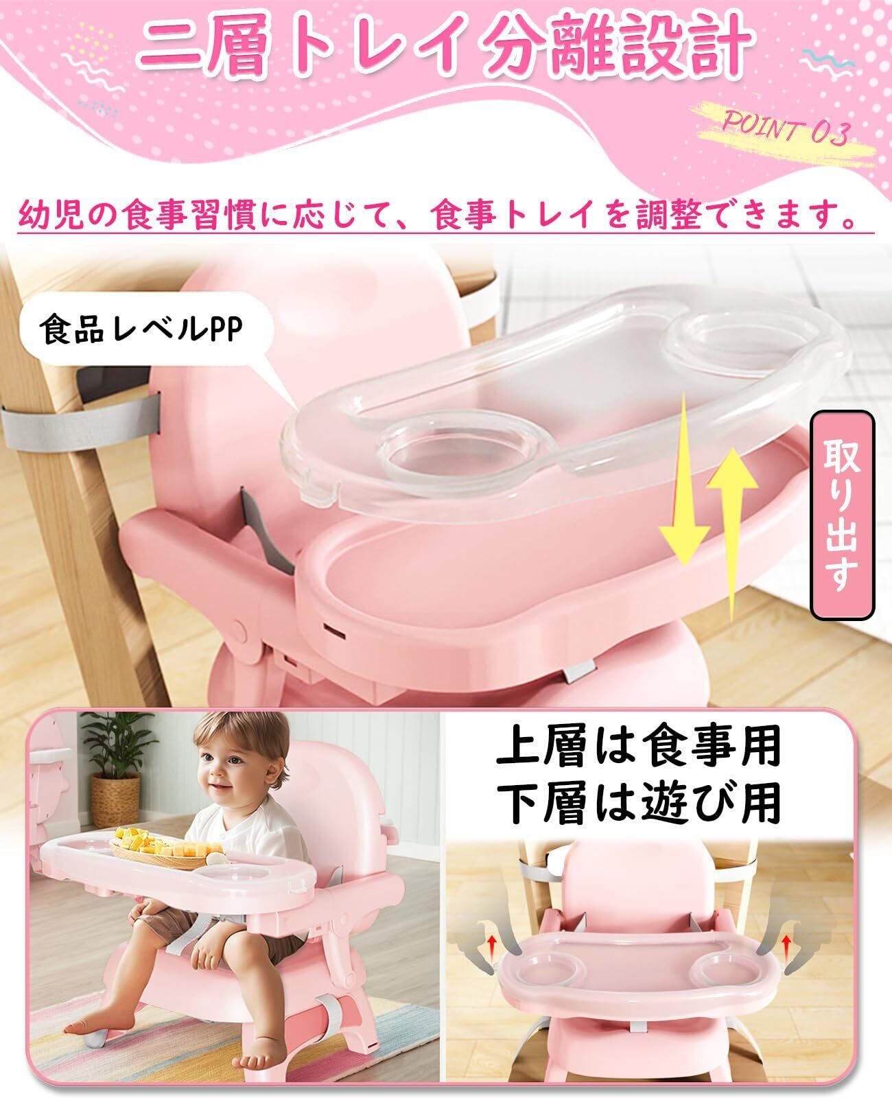 ●3IN1多機能ベビーチェア:この多機能な子供用食事椅子は、大人のダイニングチェアに固定でき、高さも調節可能です。ハイチェアとして使用できます。ダイニングトレイは取り外して、日常に赤ちゃん用テーブルチェアとして使用できます。
