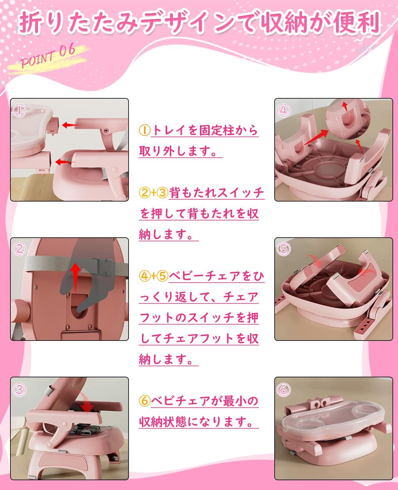 JUNHOTAI ベビー ローチェア 3IN1 子供いす 食事 折りたたみ式 赤ちゃん ダイニングチェア 子供 離乳食 お食事椅子 滑り止め 高さ調節可 6カ月頃~5才頃 軽量 収納便利 ピンク