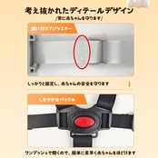 【しっかり固定できる固定ベルト】腰ベルト、股ベルトと肩ベルトの5点式ベルトでしっかり固定できます。イスでのお食事に慣れてきたら3点式ベルトに切り替え。上半身が自由になるので、 ベビー専用のチェアがなくても安心して、食事を楽しめます。(注:ボタンを固定できない場合は、ボタンの方向を逆にするか、位置を変えてもう一度お試みしてください。)