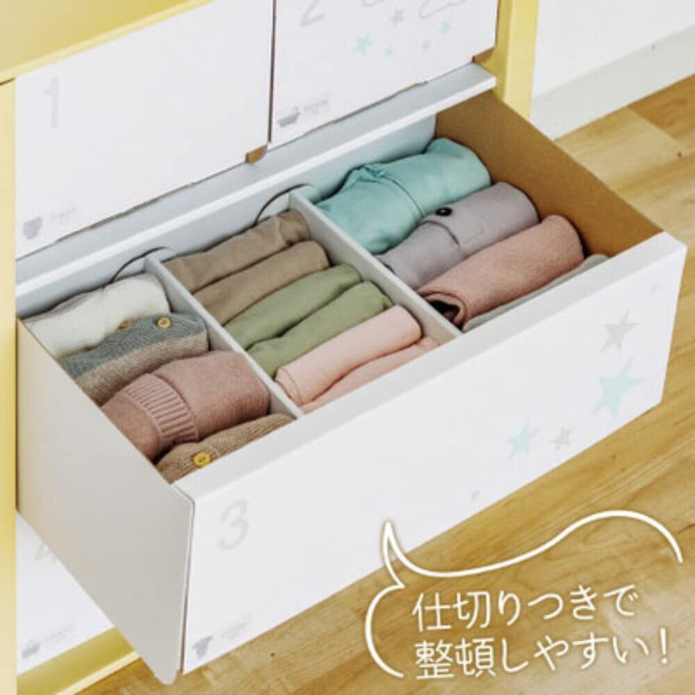 ②最適容量&”お世話ごと収納”で出し入れしやすい…必要なものがまるっと入る!すっきり縦型収納でモノを探す時間をカット。おむつ替え・沐浴・お着替え・おでかけ・おもちゃと、1つの引き出しに1つのお世話グッズをまとめられて管理しやすい