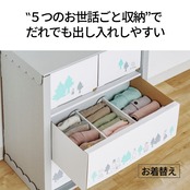 ②最適容量&”お世話ごと収納”で出し入れしやすい…必要なものがまるっと入る!すっきり縦型収納でモノを探す時間をカット。おむつ替え・沐浴・お着替え・おでかけ・おもちゃと、1つの引き出しに1つのお世話グッズをまとめられて管理しやすい
