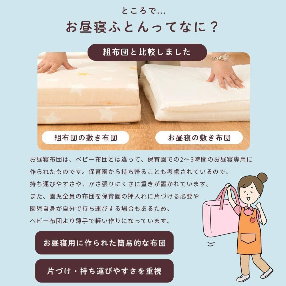 【ご使用上の注意事項】対象年齢:25ヶ月以上。この商品は、あくまでもお昼寝用としてのおふとんですので、長時間の睡眠には適しておりません。うつぶせ寝でのご使用はお避けください。製品に表示されている方法でお取り扱いください。