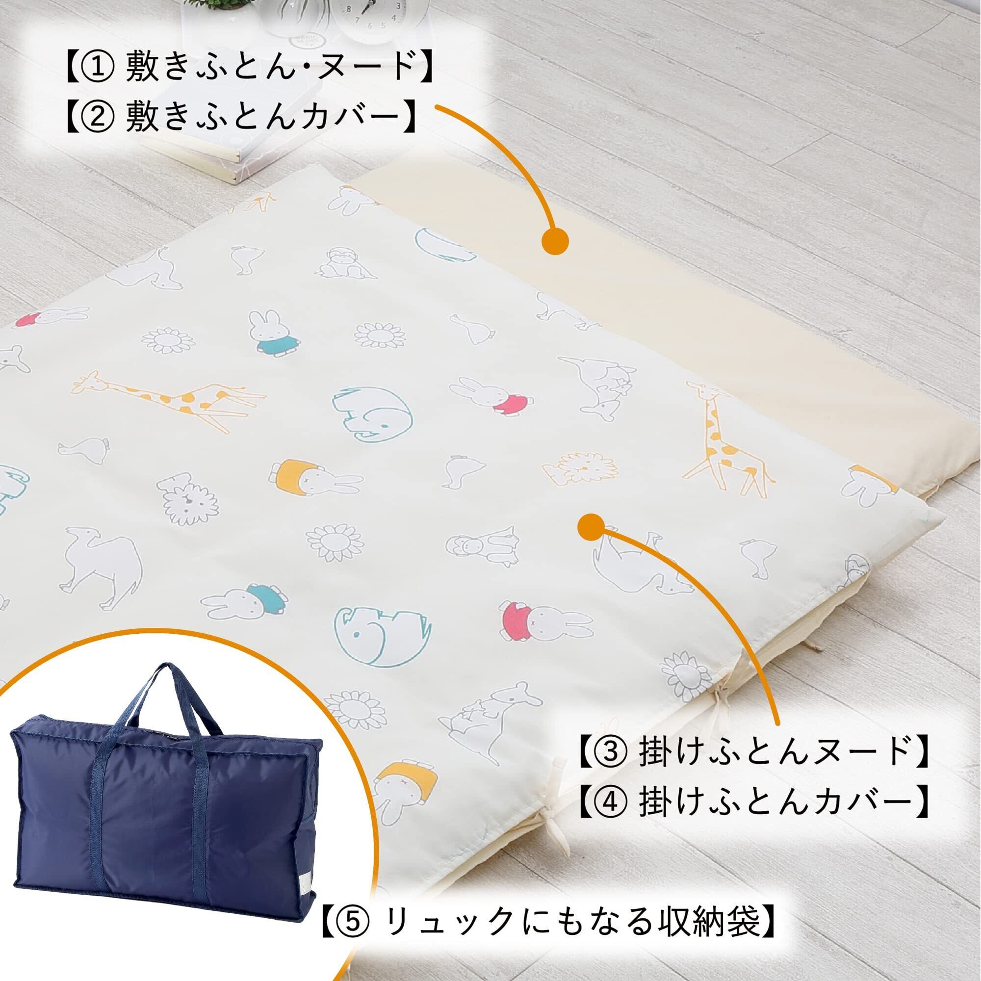 専用バッグが付いて便利。ミッフィーのお昼寝布団5点セット。◆掛け布団も敷き布団も洗濯機OK。いつも気持ちよく使えます。◆掛け布団、敷き布団のそれぞれにカバー付き。◆専用バッグは手持ちはもちろん、リュックにもなります。荷物が多い時やお子さんと一緒の時でも手が空くので便利です。防水タイプでちょっとした時も安心。◆ミッフィーと動物が並んだ、眠るのが楽しくなる可愛いデザインです。◆【セット内容】掛け布団、敷き布団、掛け布団カバー、敷き布団用カバー、専用バッグ 【サイズ】掛け布団:80×110cm、敷き布団:70×120cm、掛け布団カバー:80×110cm、敷き布団カバー:70×125cm、専用バッグ:41×72×15cm◆【素材・組成】(掛け布団)側生地:ポリエステル100% 詰めもの:ポリエステル100% (敷き布団)側生地:ポリエステル100% 詰めもの:ポリエステル100% (掛け布団カバー)ポリエステル65% 綿35% (敷き布団カバー)ポリエステル65% 綿35% (専用バッグ)ポリエステル100% ◆【生産国】中国