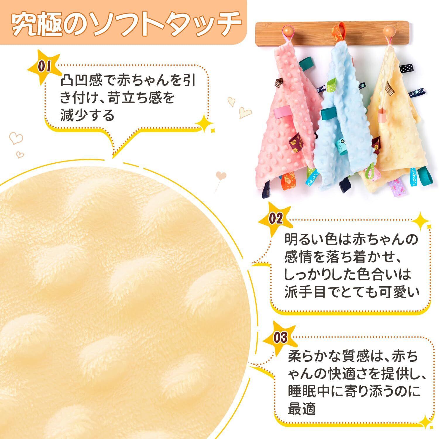ベビータグ付きタオル よだれ拭き 25CMx25CM 正方形 小型ブランケット カラフルなタグ付き 赤ちゃんを癒す 知覚覚醒 3か月以上の赤ちゃん 男の子と女の子向け (イエロー)