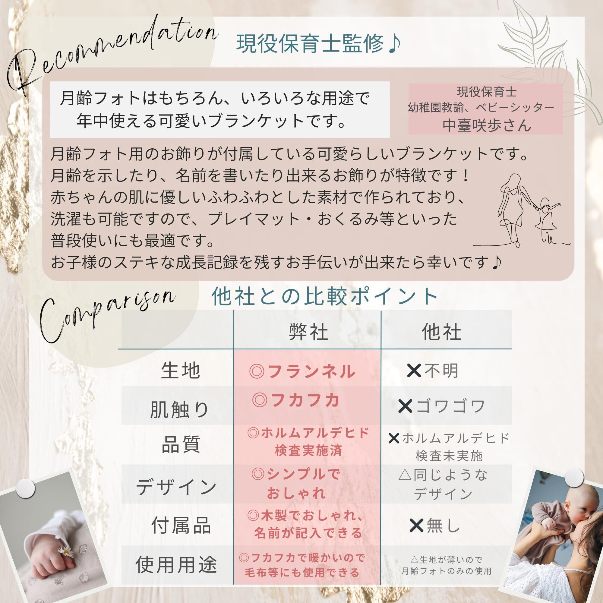 【現役保育士が監修する温かさと安心のこだわり素材】ふかふかのフランネルで安心のホルムアルデヒド検査済みなので、赤ちゃんにも安心してお使い頂けます。また、洗濯が可能で清潔に保つことが出来ます。保育士からの推薦も高く、赤ちゃんの成長を愛情たっぷり記録できるベビーグッズです。