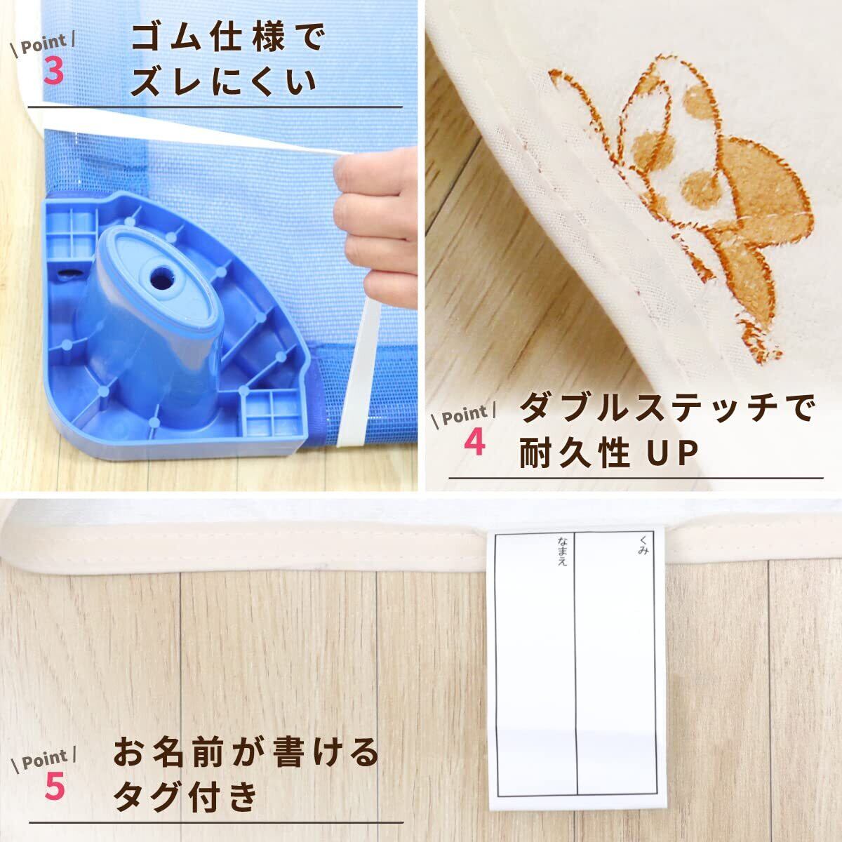 【四隅ゴム付き】カバー裏面の四隅に付いたゴムを、お昼寝コット本体の足の部分へ引っ掛けるだけで簡単に装着できます