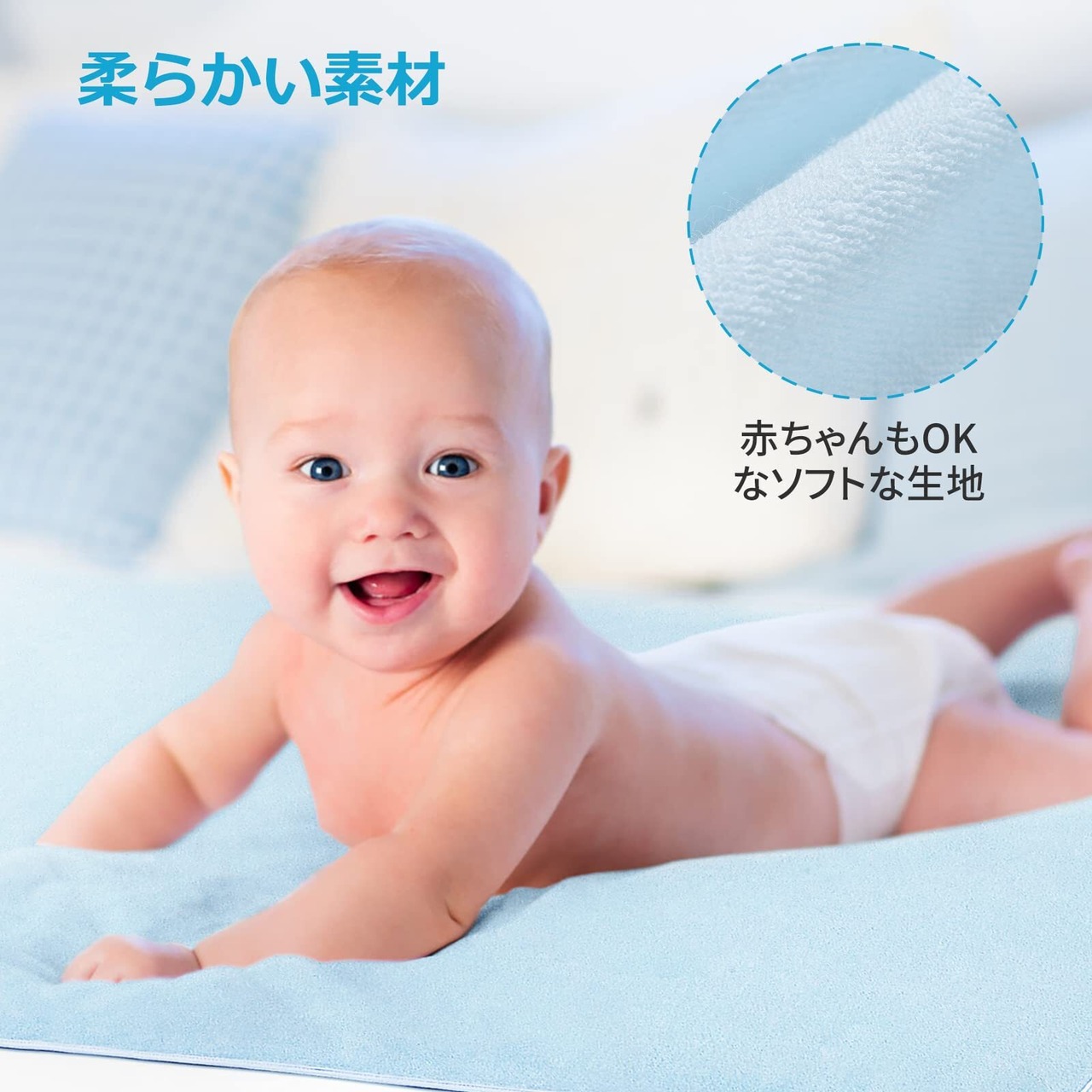 【通気性がよく、快適な素材】このおねしょシーツの表面は綿70%、ポリエステル30%で、とても柔らかく滑らかな肌触りで、チクチクしません。快適性と通気性を兼ね備えているので、使用時に蒸れることがありません。裏面はポリウレタンコーティングされた素材で、液体をしっかりと遮断し、浸透させません。