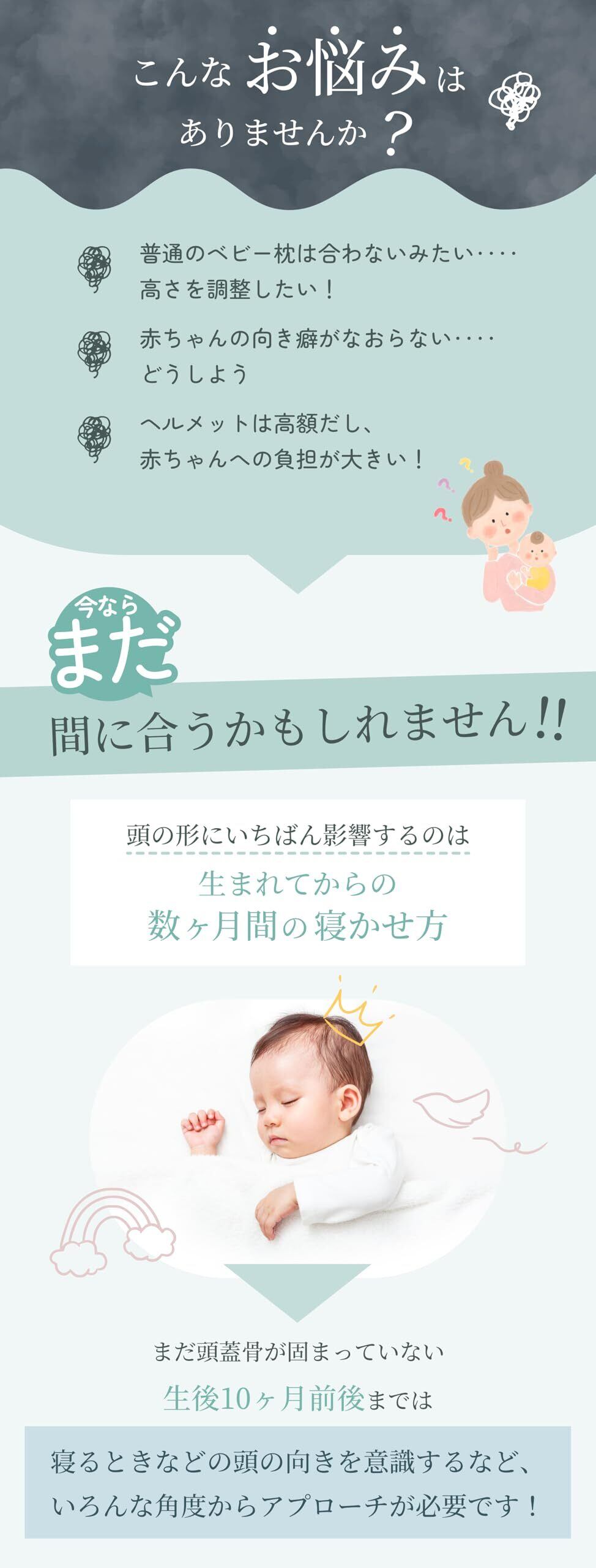【頭の形を整える工夫された形状】 圧力を分散する特殊な形状で、赤ちゃんの頭の形 を整えます。赤ちゃんの絶壁防止に効果的です。
