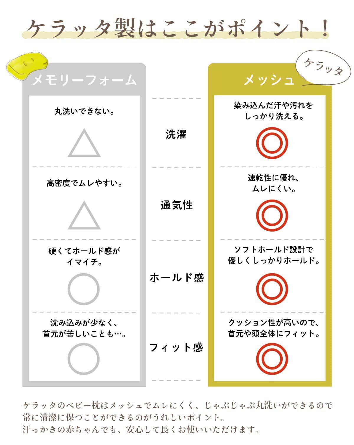 ポイント2「丸ごとじゃぶじゃぶ洗えるメッシュ素材」…本体は通気性の高いメッシュ素材なので、ムレにくく安心です。速乾性にも優れているので、染み込んだ汗や汚れも、じゃぶじゃぶ洗えてあっという間に乾くので、扱いやすくいつでも清潔をキープできます。 ポイント3「カバーはやさしい風合いの素敵なイブルガーゼ」…ケラッタのベビー枕は高機能なだけでなく扱いやすく、じゃぶじゃぶと丸洗いできるのもうれしいポイント。清潔感を保つことができ、長くお使い頂けます。