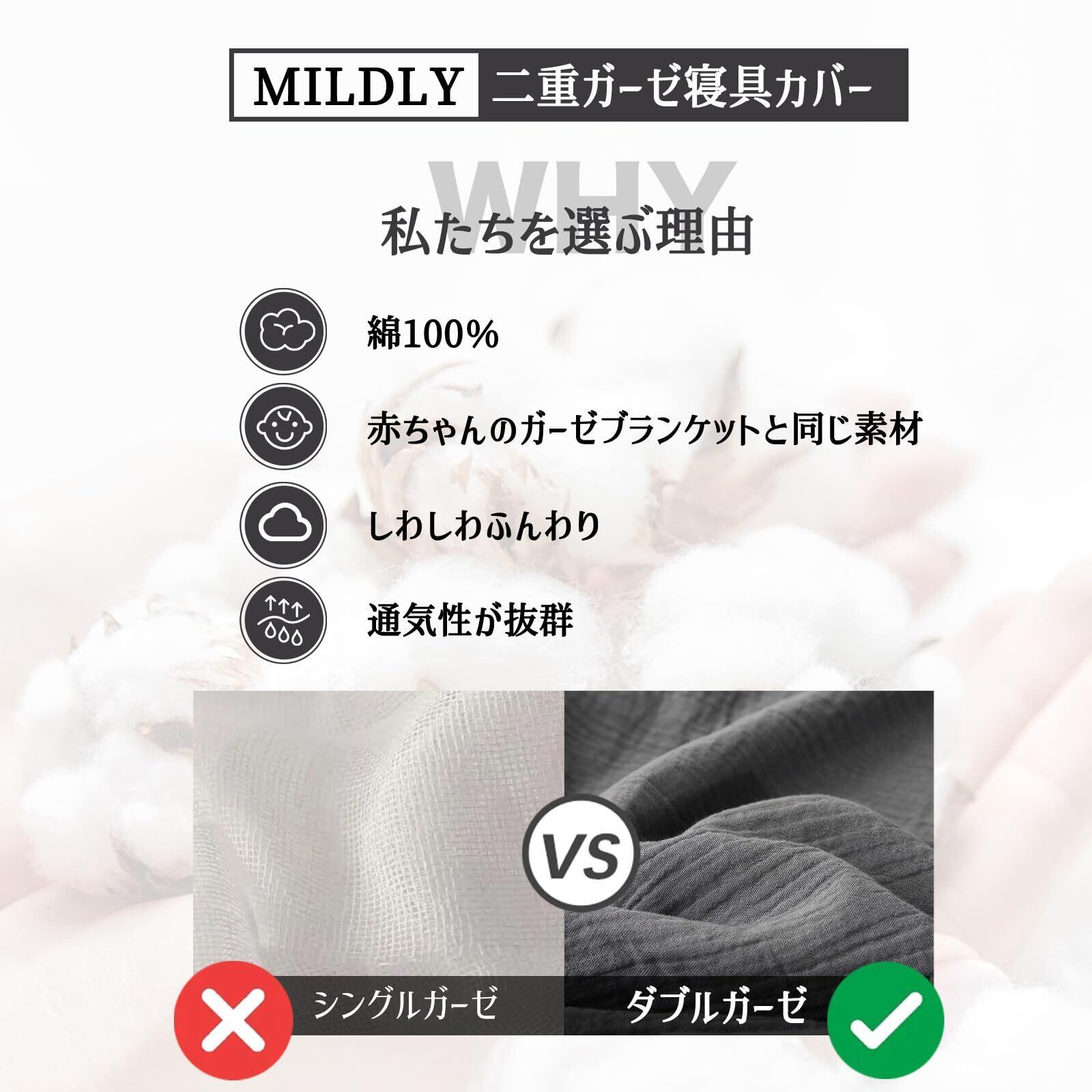 【ダブルガーゼ】MILDLYのダブルガーゼ寝具カバーは、ベビーグッズなどでよく使われている素材と同じガーゼ素材を採用しています。ただし、MILDLYのダブルガーゼは従来のものとは異なり、薄いガーゼを単に2枚重ねて直接縫い合わせるのではなく、織りの過程で二重のコットン糸を使用しています。これにより、糸が交わりながら織り上げられ、通常のガーゼよりも耐久性が向上し、より長寿命です。ダブルガーゼの特長は肌に優しく、通気性があり、ふんわりと柔らかいことです。通年を通して全年齢層に適しています。