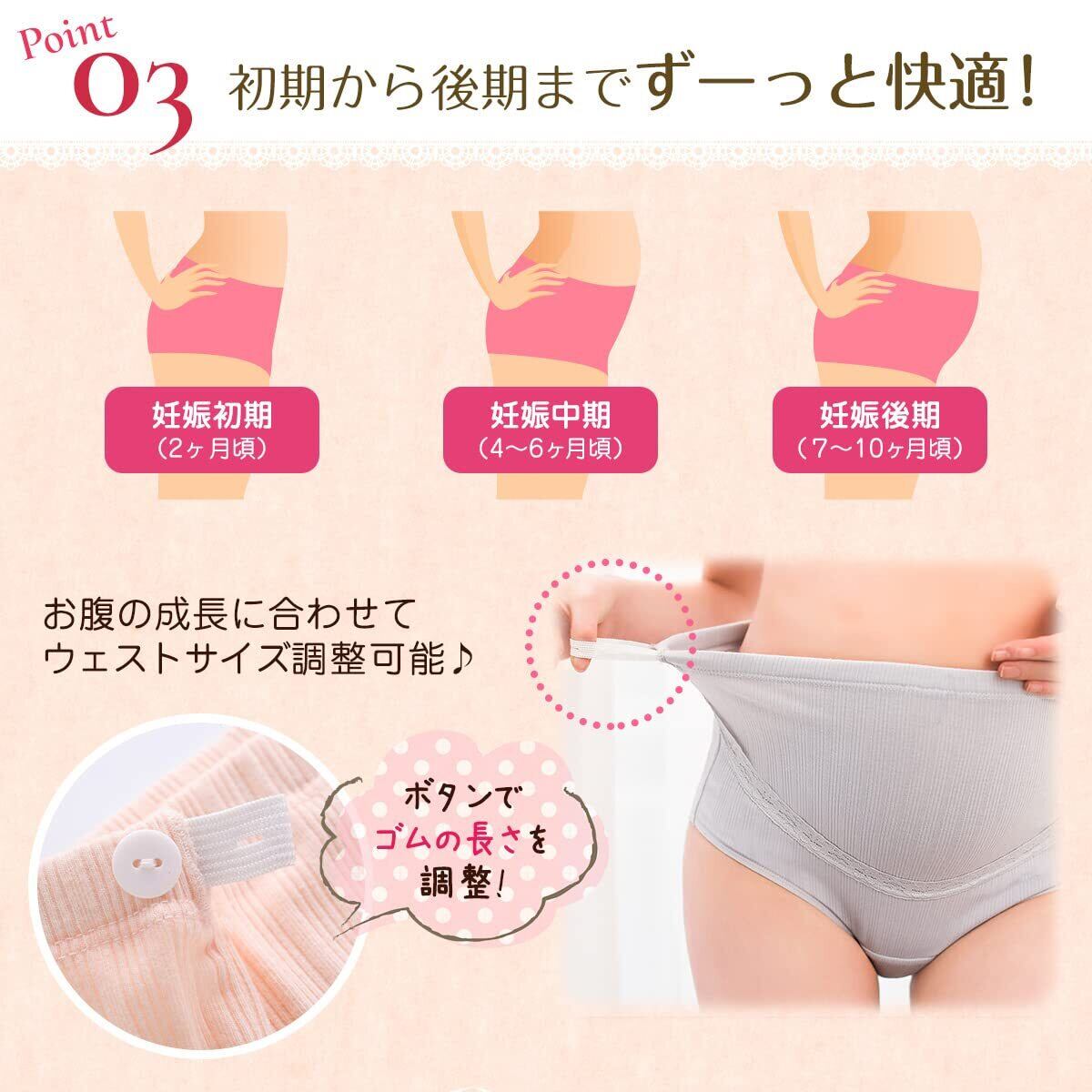 お腹の成長に合わせてボタンでゴムの長さ調整可能 妊娠初期から後期ままで長くお使いいただけます。