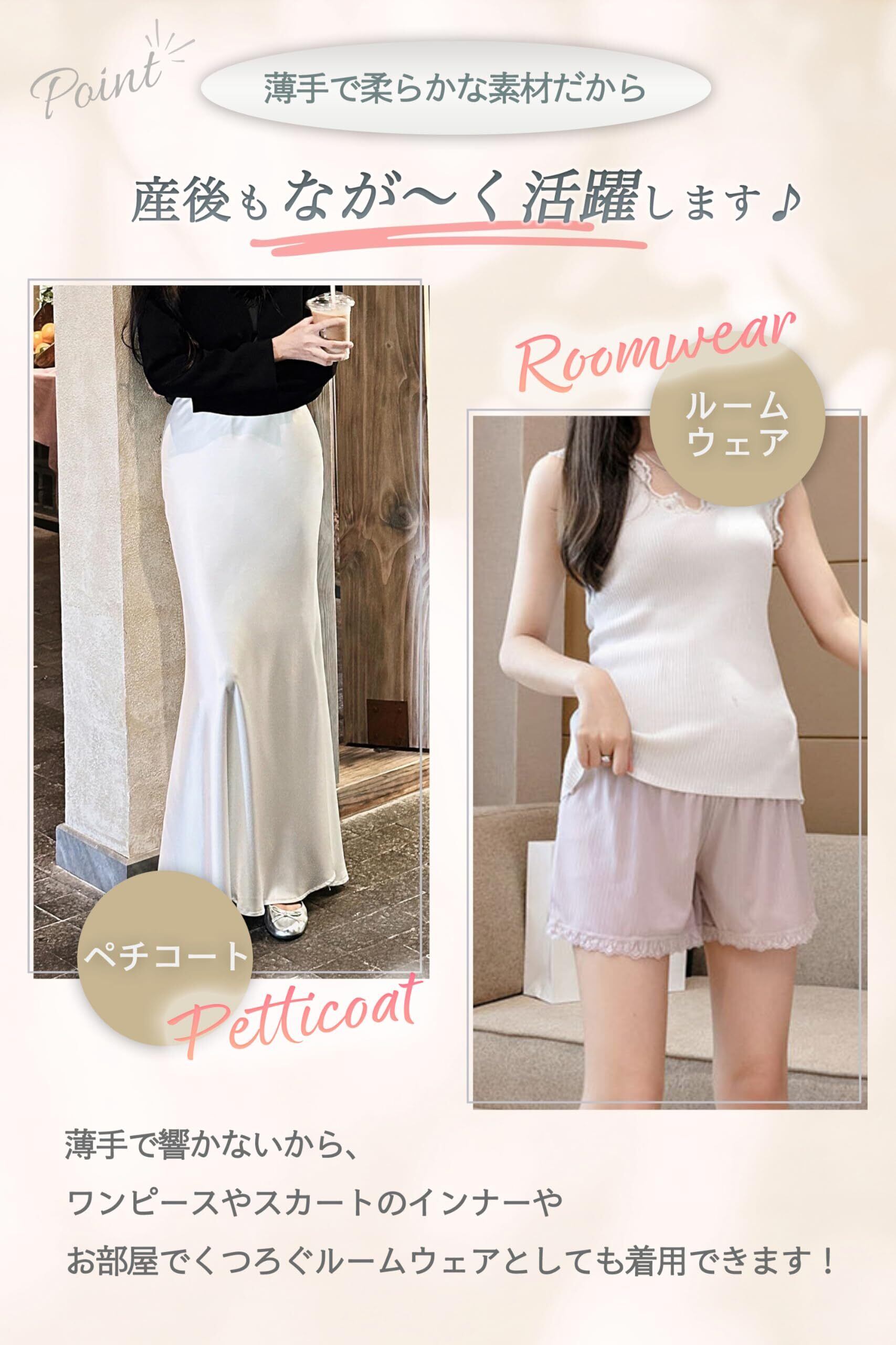 妊娠初期から産後まで使える調節可能なハイウエスト設計。 チクチクしない肌に優しいレース付きで可愛く、さらっと快適な薄手素材。 締め付けずリラックスでき、インナーやショートパンツとしても着用できます。 おしゃれも快適さも叶える一枚です。