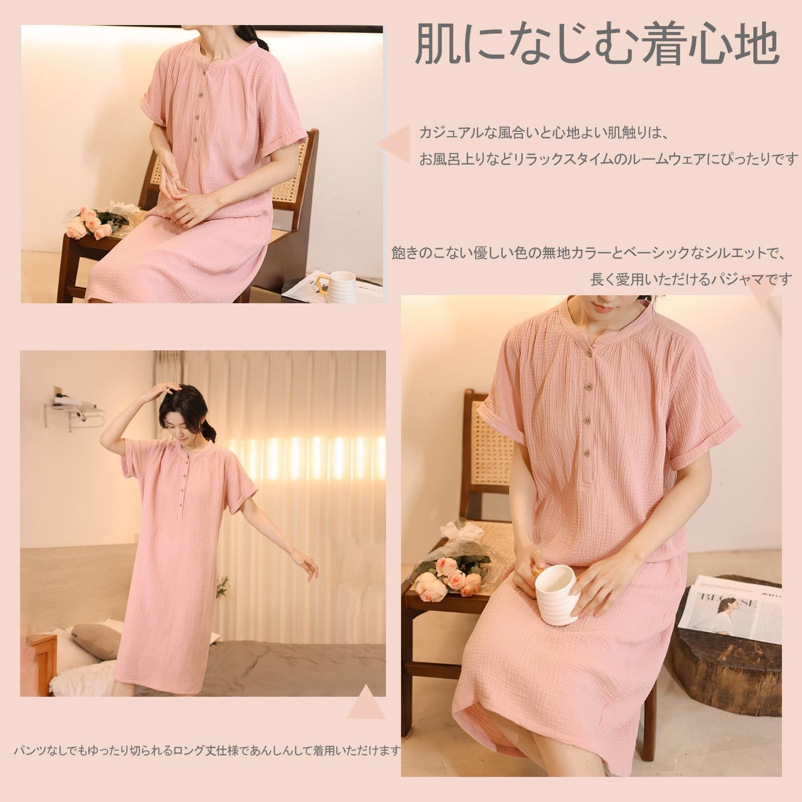 【100%綿素材】:綿100%の柔らかさと通気性が特徴のルームウェア ワンピース、ダブルガーゼ生地、ふんわり感。優れた通気性で夏は涼しく、冬は空気を含んであたたかいガーゼ素材で1年中使えます。季節を問わず感触を楽しむことができるレディース用パジャマです