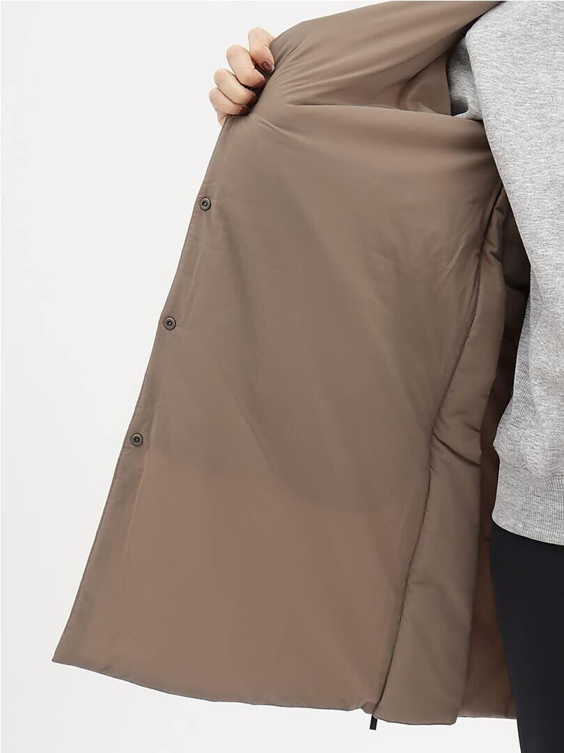 腹囲に合わせてシルエットが調整でき、妊娠中も産後も着用できる中わた入りカーディガンです。表地と裏地は通気性の高いメカニカルストレッチ素材。リサイクルナイロン生地にはっ水加工を施しており、多少の雨は弾きます。中わたには、通気性とストレッチ性に優れるスリット入り化繊わたのベントリックスを使用。背中と肩周りにスリットを入れることで、代謝の上がる妊娠中や、産後の子どもとの活動時に動きを妨げにくく、衣服内の湿気も効率的に排出します。一方でお腹周りはスリットを入れずに保温性を確保。脇に配置したファスナーを開閉することで、シルエットの調節が可能。お腹が大きくなる妊娠中もゆったりと着用ができます。静電気の発生を抑える静電ケア設計を採用。コンパクトに収納でき、携行に便利なスタッフサック付きです。