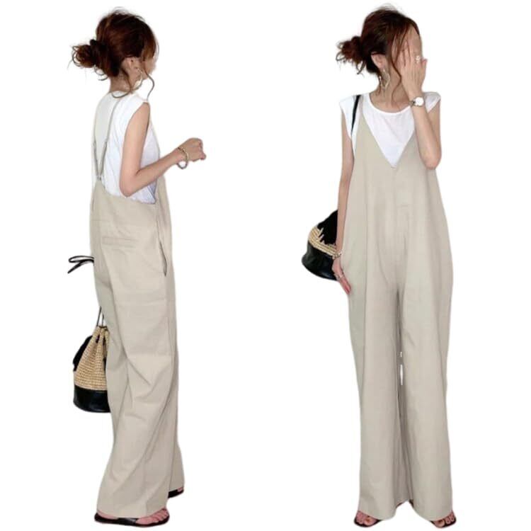 88flix サロペット レディース 韓国 オールインワン ワイドパンツ ロング キャミサロペット 着痩せ 無地 Vネック 体型カバー ゆったり