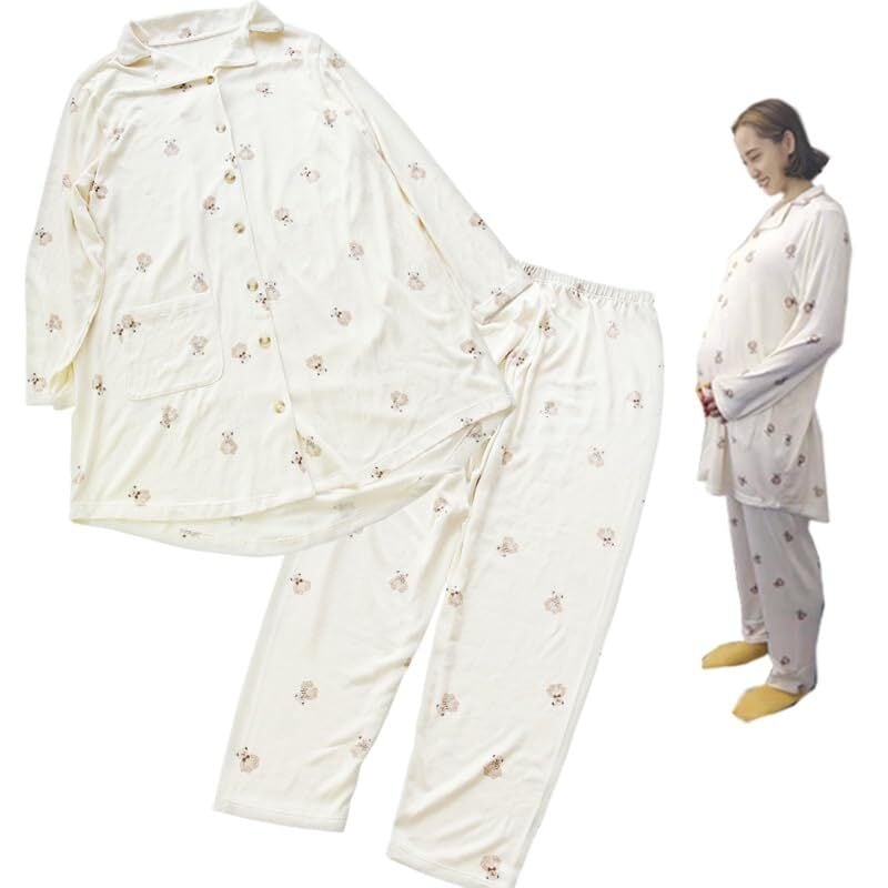 テディベア柄 マタニティパジャマ 長袖 前開き ウエスト調整機能付き (くま M~L)