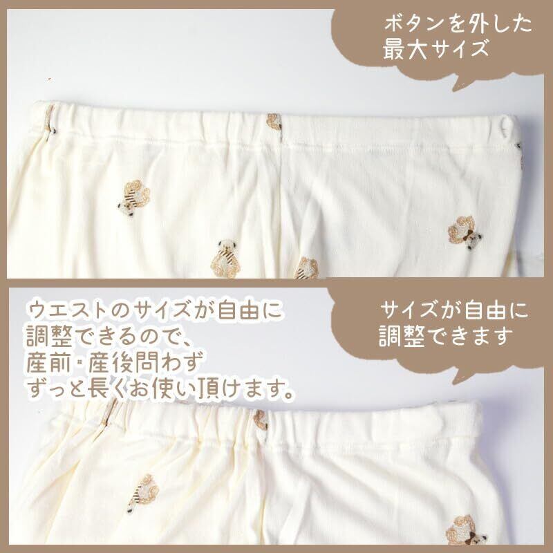 ウエスト調整機能付きのゴム仕様で、ボタンでサイズ調整が可能。妊娠中から産後まで、長く快適にお使いいただけます。